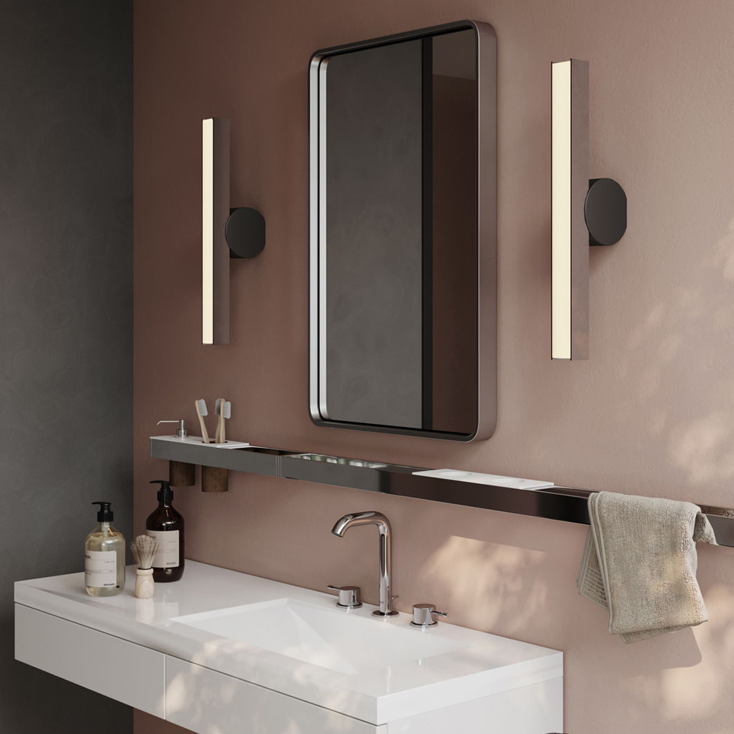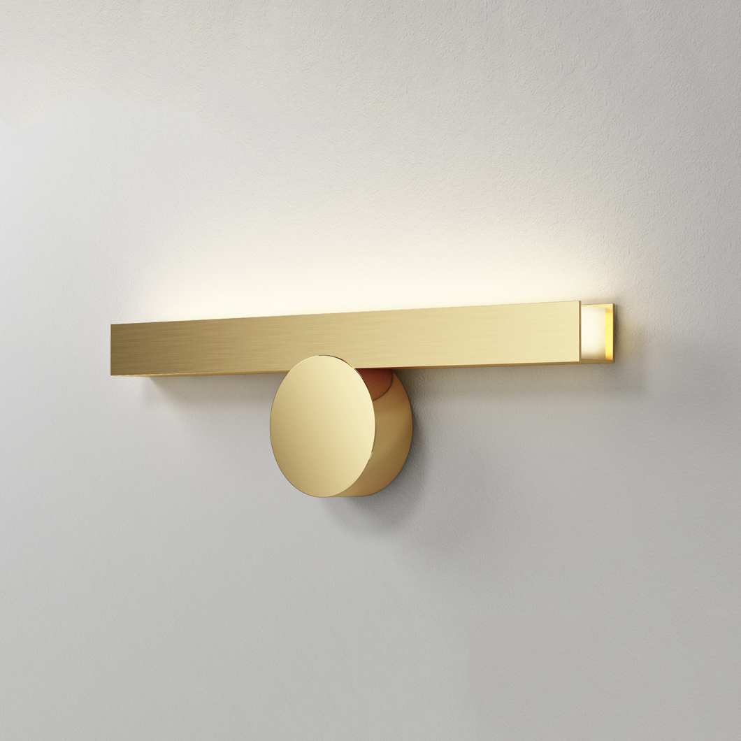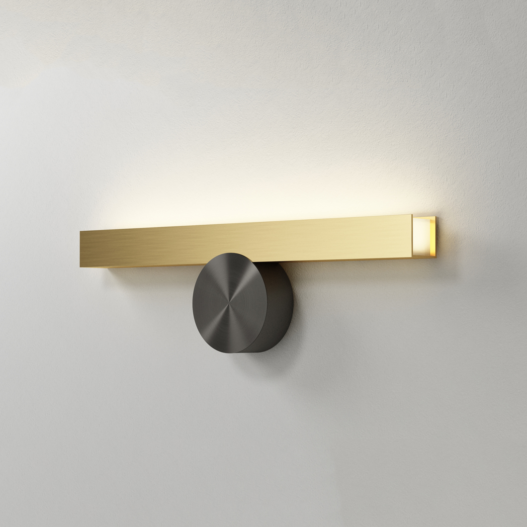 Cale(e) IP44 wall light is clear and refined in its sharp brass structure; complete with the distinctive graphite disc to accompany it. The IP collection are a series of wall lights designed for bathrooms. With their splash-proof exterior, these luminaires can be used in bathroom zones two and three. Cale(e) are a family of minimalist, geometric luminaires consisting of a black circular focal point, and an accompanying solid brass rectangular structure which varies in orientation with each version. This IP44 wall light is available in three similar shapes, which are mounted to the wall in different positions. VH is mounted from the side, whereas VV and VF are installed from the front profile. While VV is fixed in a sophisticated straight orientation, VF is at a downward-facing angle, illuminating a warm white LED glow upon the surrounding area below.
