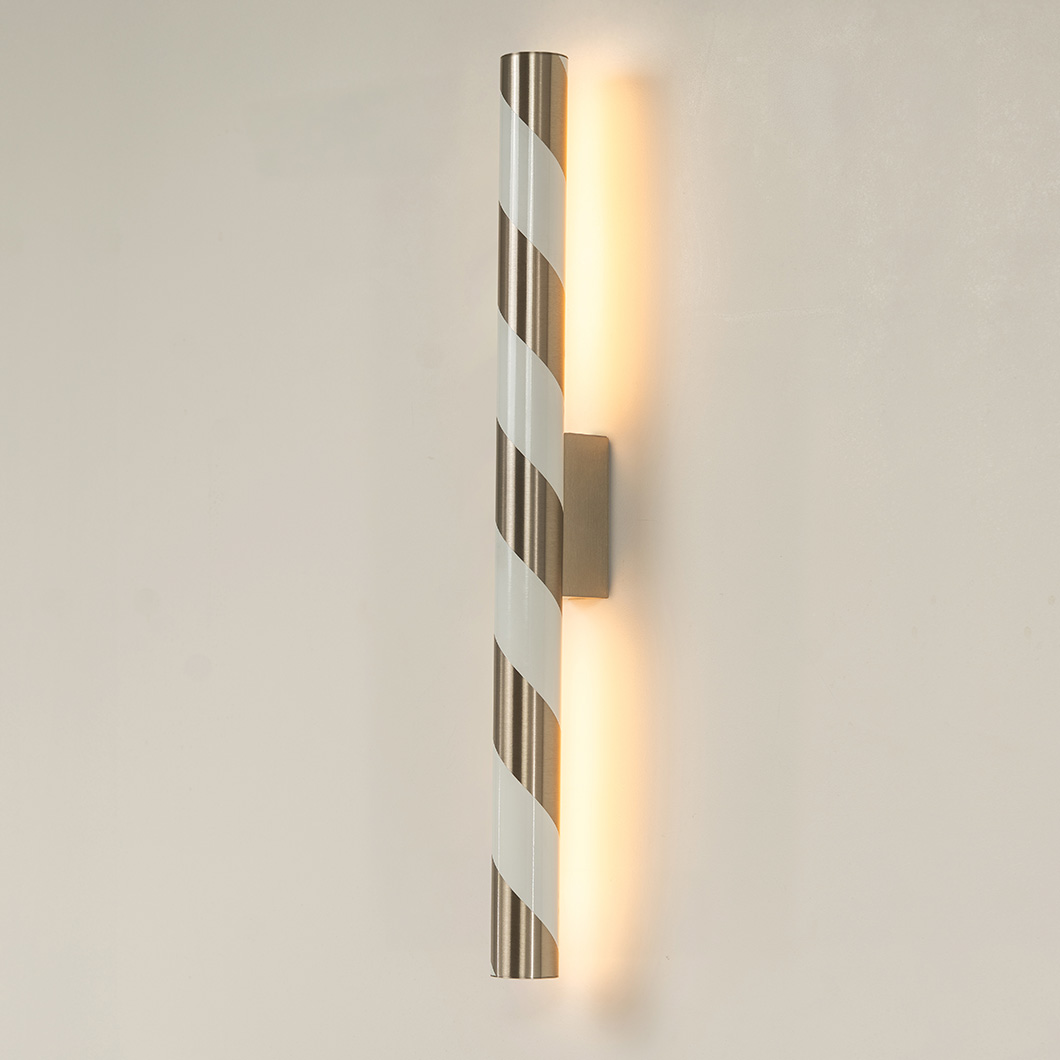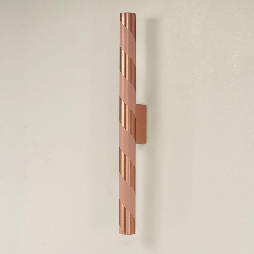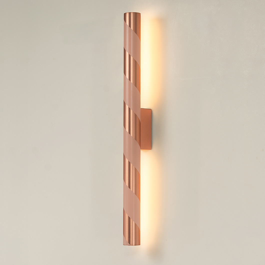 Designed to showcase the core expertise of CVL, Candy offers expert craftsmanship, shaping brass into a tubular form. The minimalist structure showcases the purity of the metal and the precision of the signature finishes, offering indirect backlighting on the wall where it is installed. The simplicity of Candy's form is subtly enhanced by its lacquered spiral pattern, wrapping around the cylindrical wall fixture like a candy cane.