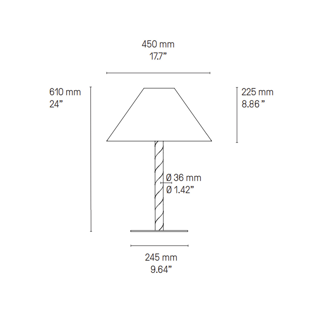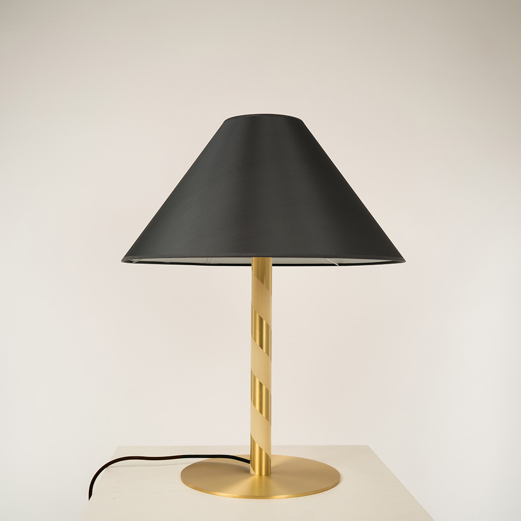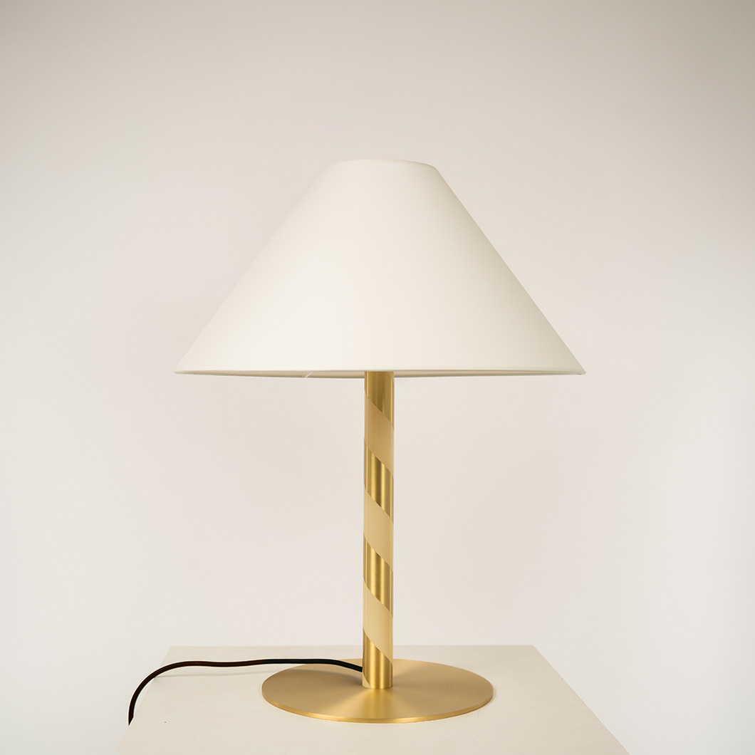 Designed to showcase the core expertise of CVL, Candy offers expert craftsmanship, shaping brass into a tubular form. The minimalist structure showcases the purity of the metal and the precision of the signature finishes. The simplicity of Candy's form is subtly enhanced by its lacquered spiral pattern, wrapping around the cylindrical stem like a candy cane. Candy's slender metal base secures a tapered textile lampshade to diffuse a soft, ambient light.