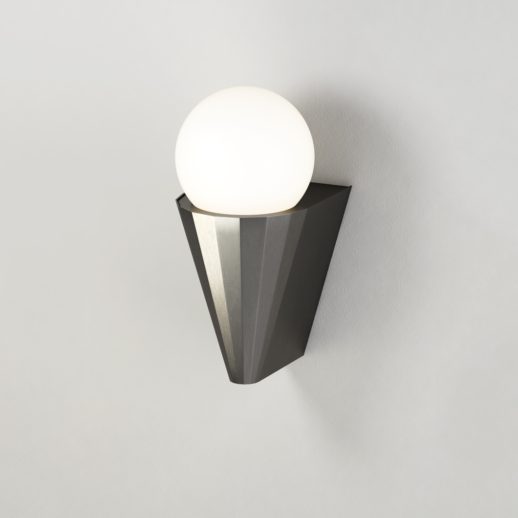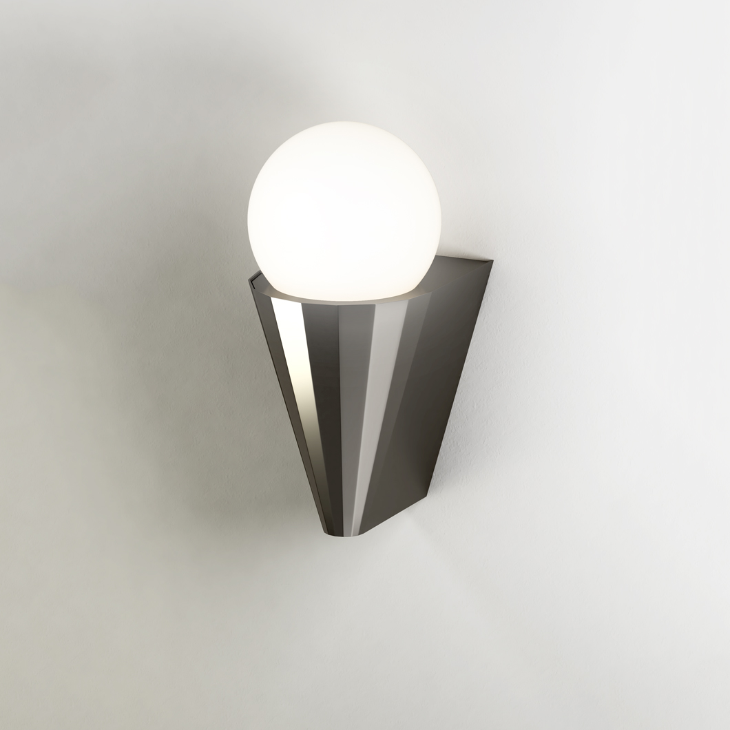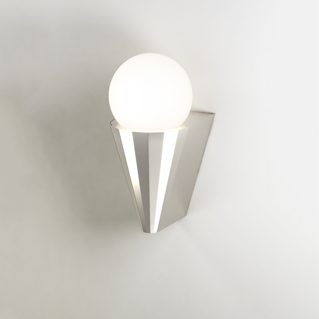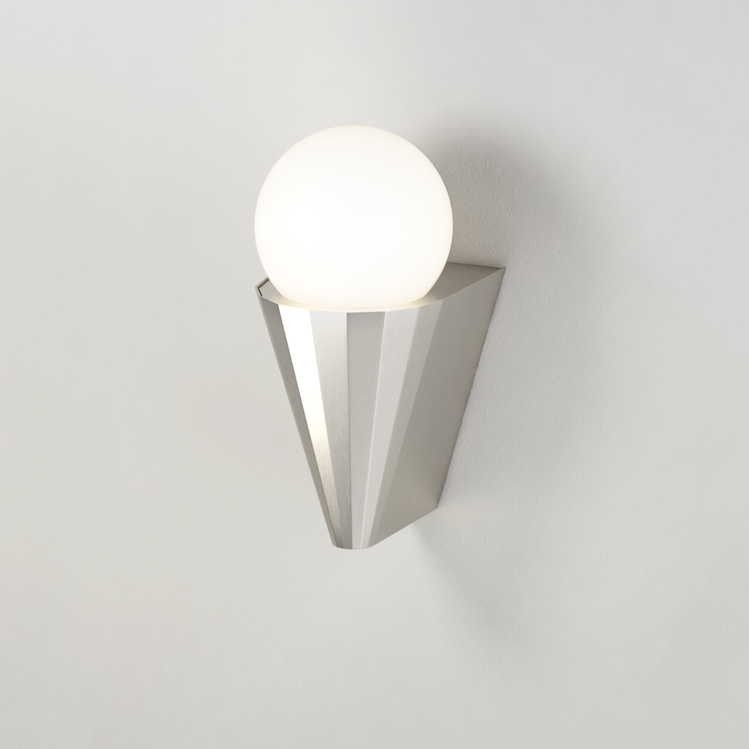 Cornet is an elegant contemporary wall light featuring a unique pyramid design, ideal for use in bathrooms. With a structure similar to that of an ice cream cone, the cone itself is a stunning polished or satin brass in your choice of finish, crafted from solid brass. Sitting upon the cone-shaped frame is the spherical opal mouth-blown glass diffuser. This houses the G9 LED lamp, casting a beautiful glow onto the surrounding ceiling and walls. The IP collection are a series of wall lights designed for bathrooms. With their splash-proof exterior, these luminaires can be used in bathroom zones two and three.