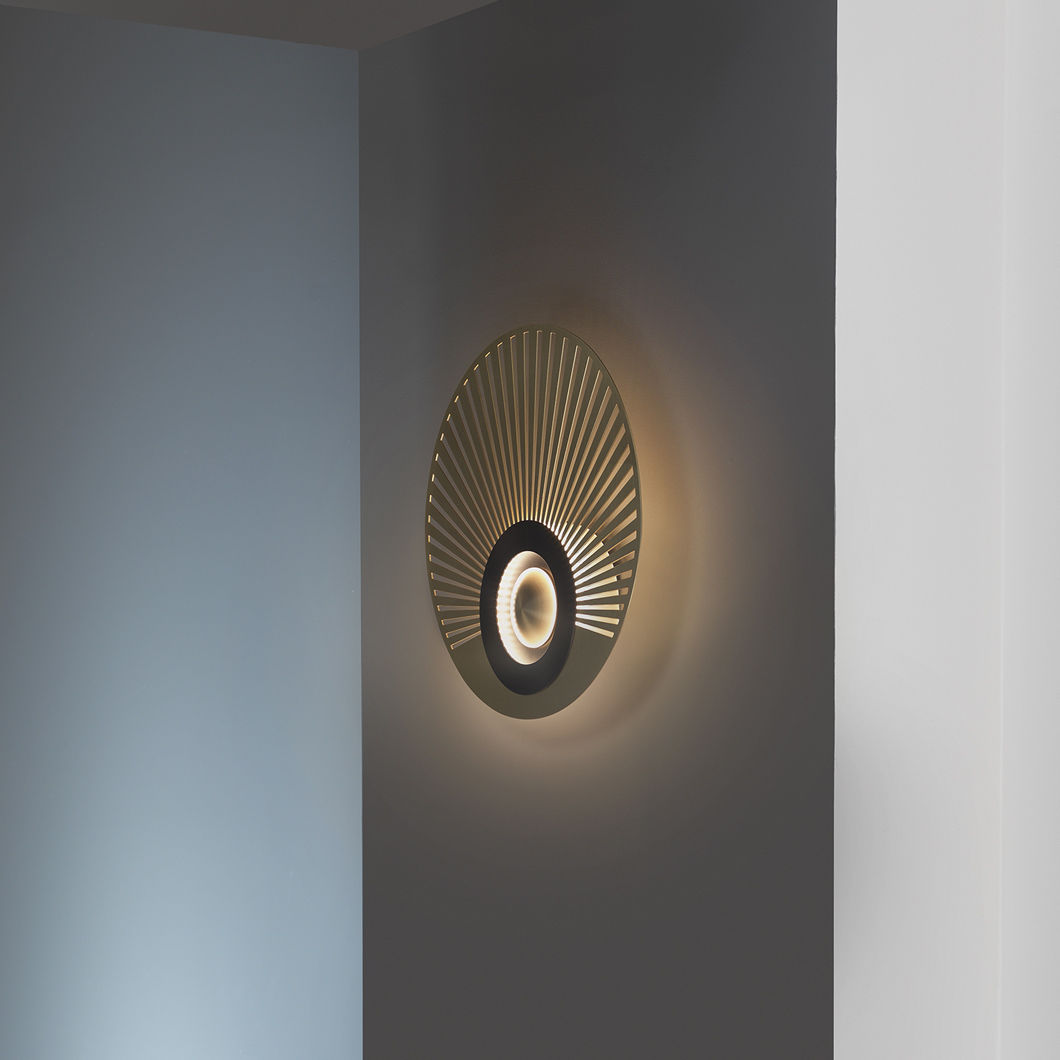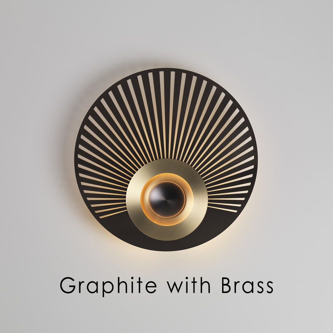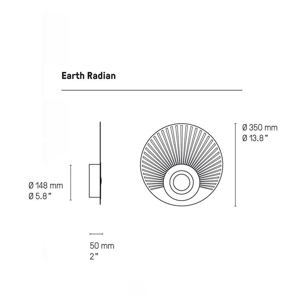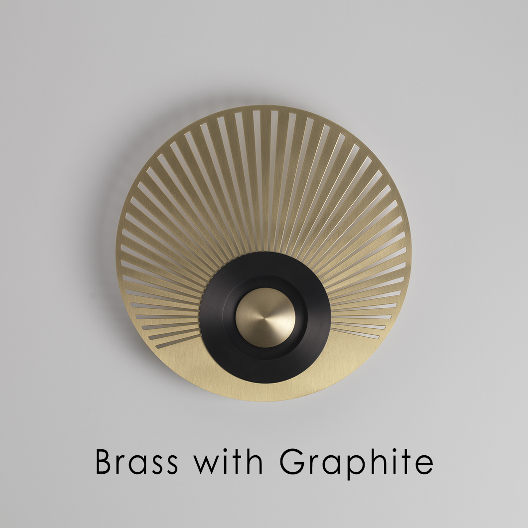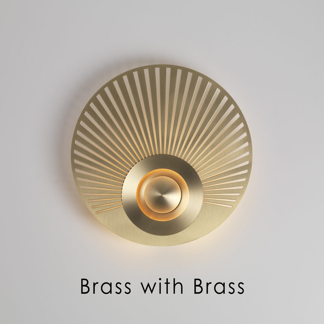 Radian appears as a seashell, with a fan-like pattern of lines which draws attention to the circular polycarbonate diffuser housing the warm LED light source. This brass structure is more detailed in its design in comparison to other members of the Earth collection, with a focal point at the bottom half of the circular frame. Customise the finish of the ring which borders the circular diffuser, allowing for either a contrasting or complimenting coating to either accentuate or take attention away from the LED light source. Earth is a family of contemporary wall lights which exude minimalism in their artistic designs and patterns, whist maintaining cohesiveness in their disc-shaped forms.