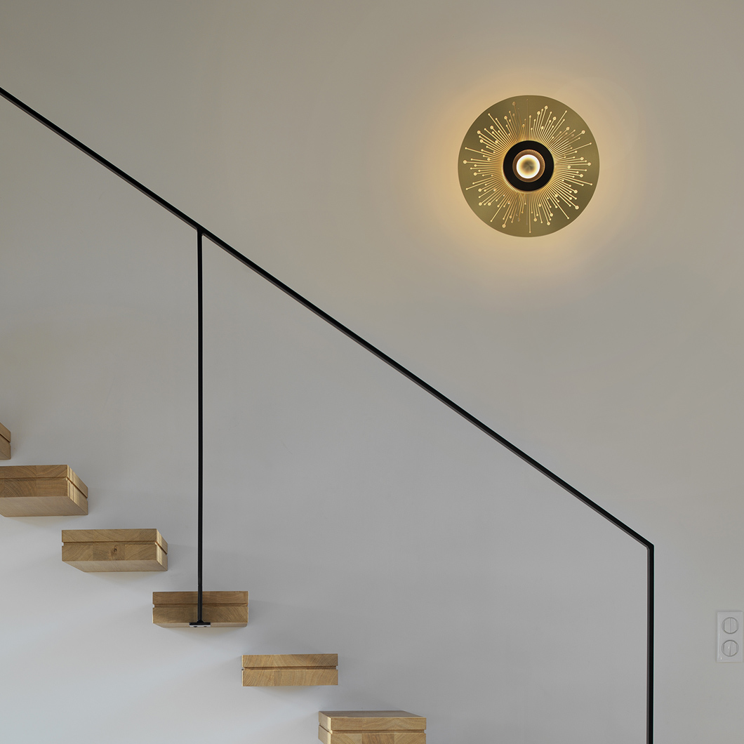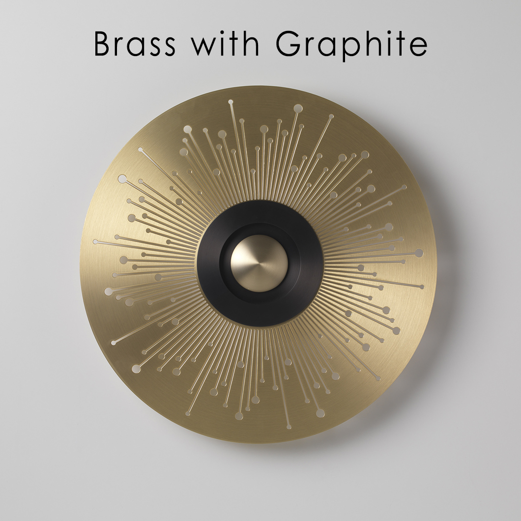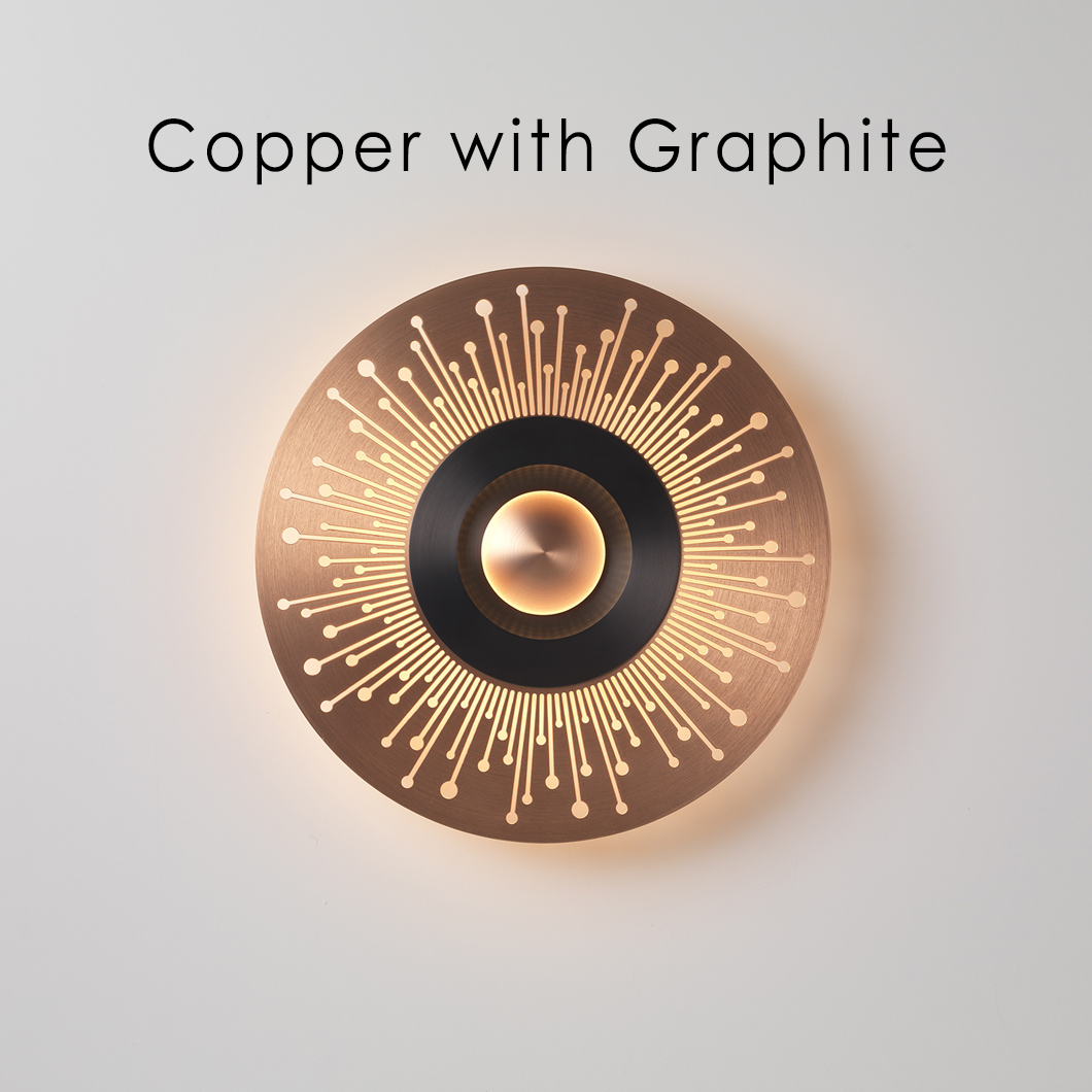 This wall lamp shows clear influence from its name in its design, with a centred polycarbonate diffuser resembling the sun, pattern of lines surrounding from the circle acting as the sun’s rays. These designs are highlighted when the wall fixture is switched on, which furthers the metaphor of the ‘sun’ aesthetic. The indirect light which creates a warm glow upon the wall behind the luminaire, creating an eye-catching illuminated patten. Bordering the centred polycarbonate diffuser is a circular disc, the appearance of which can be customised from a selection of satin finishes. This allows for either a contrasting or complimenting coating, to either accentuate or take attention away from the LED light source.