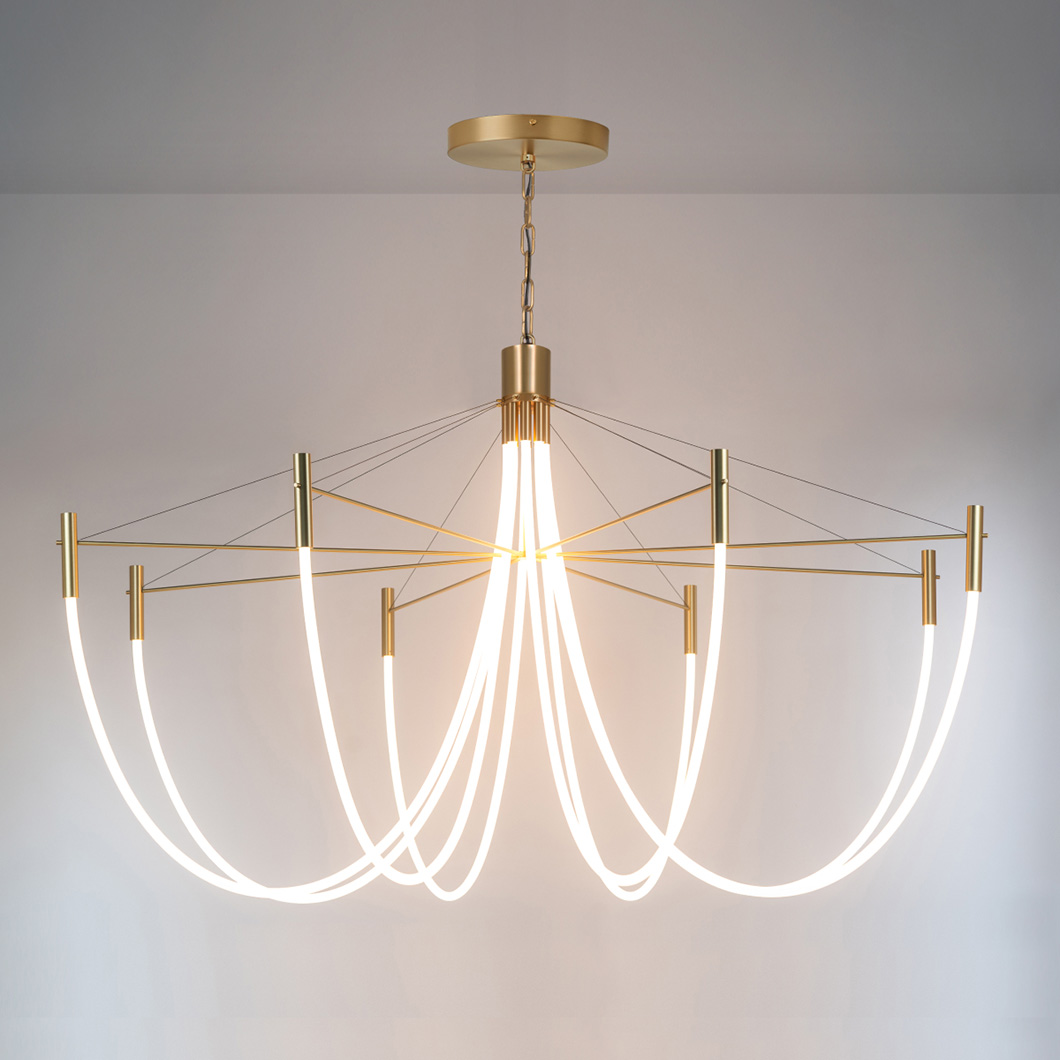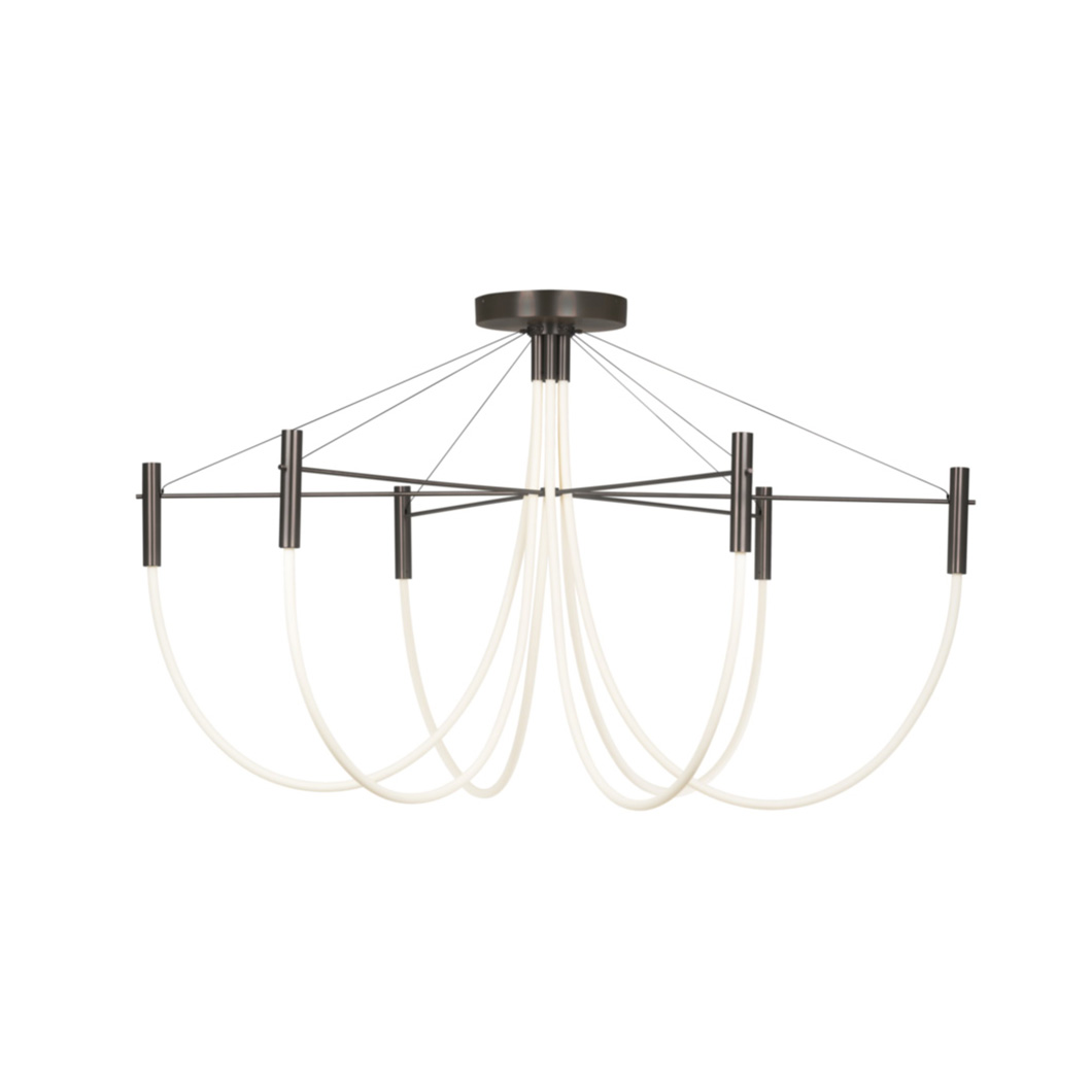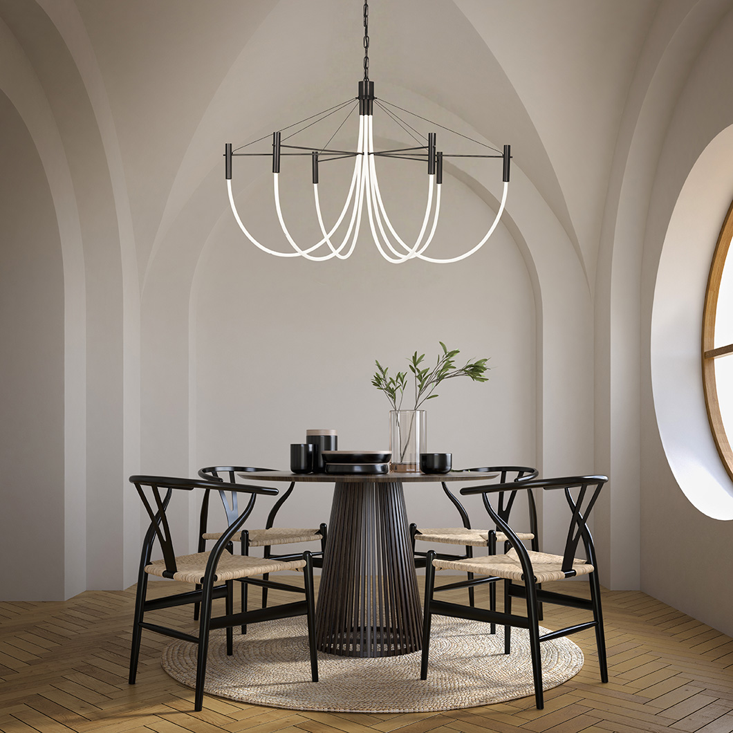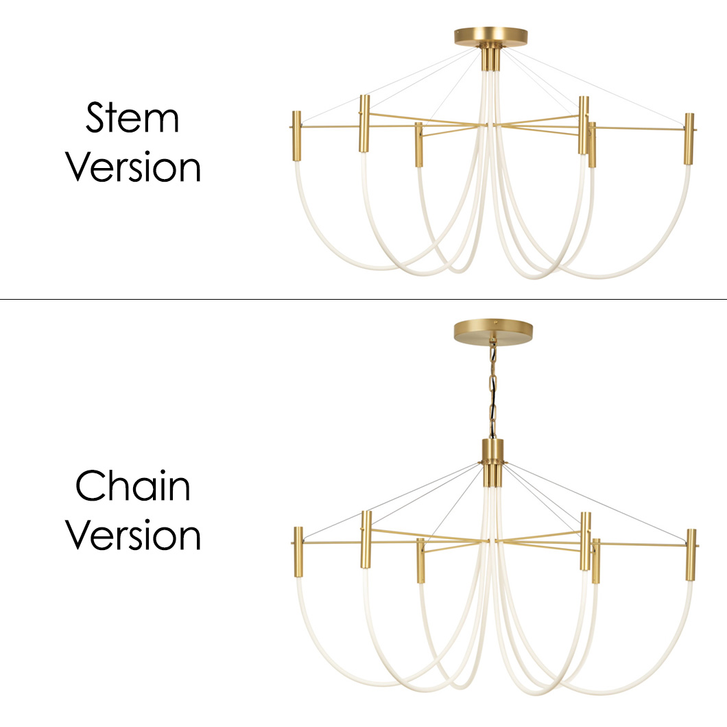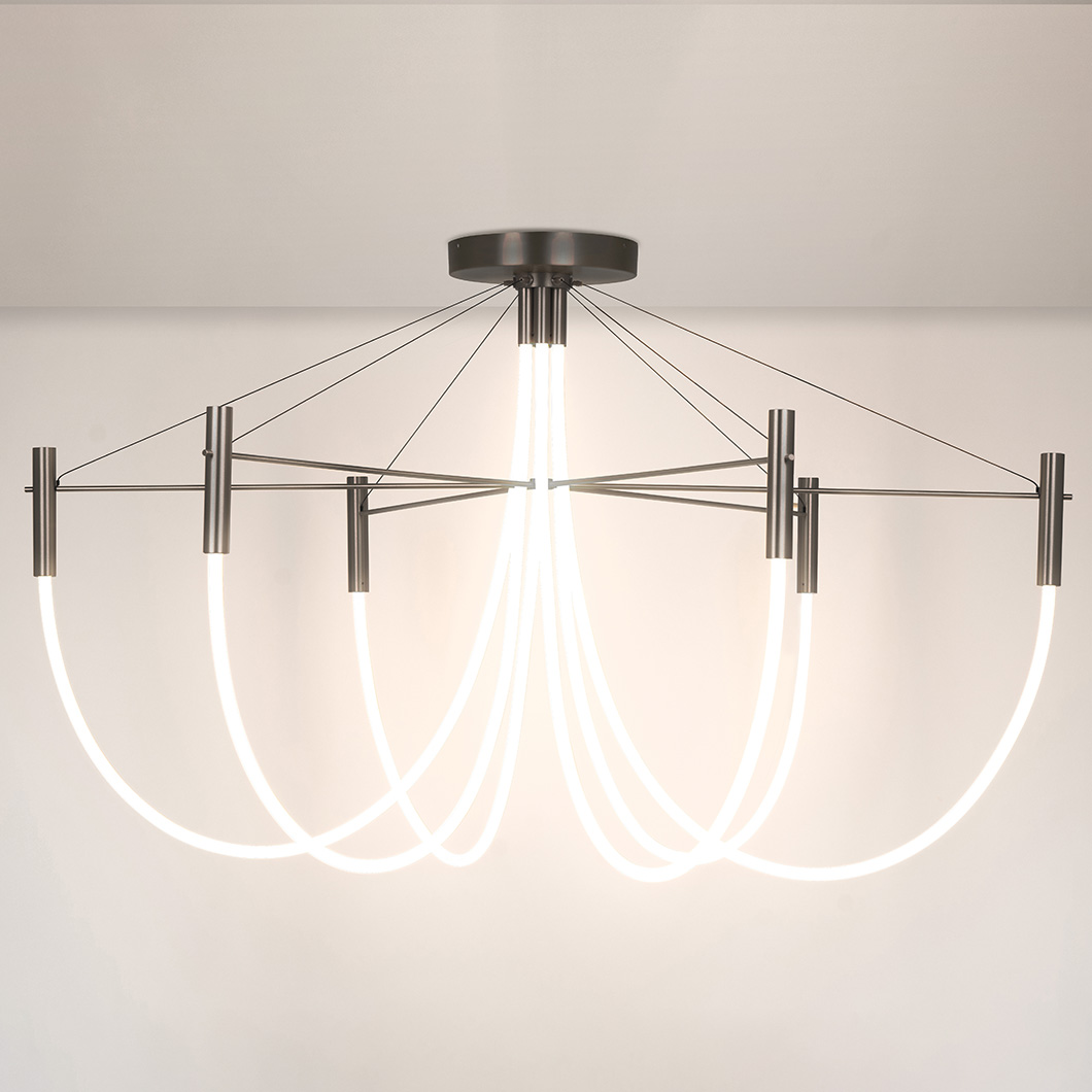 The statement chandelier is available in four metallic finishes: brass, copper, graphite, or nickel. Each finish offers a distinctive look to match a range of interiors. Paradoxe comes in three different models, offering 5, 6, or 8 illuminated arms. Each variant also offers a fixed stem version or a longer chain version, depending on the size of your space. Paradoxe is supplied with an integrated LED that diffuses a soft 2700K glow. This chandelier is phase-cut dimmable.