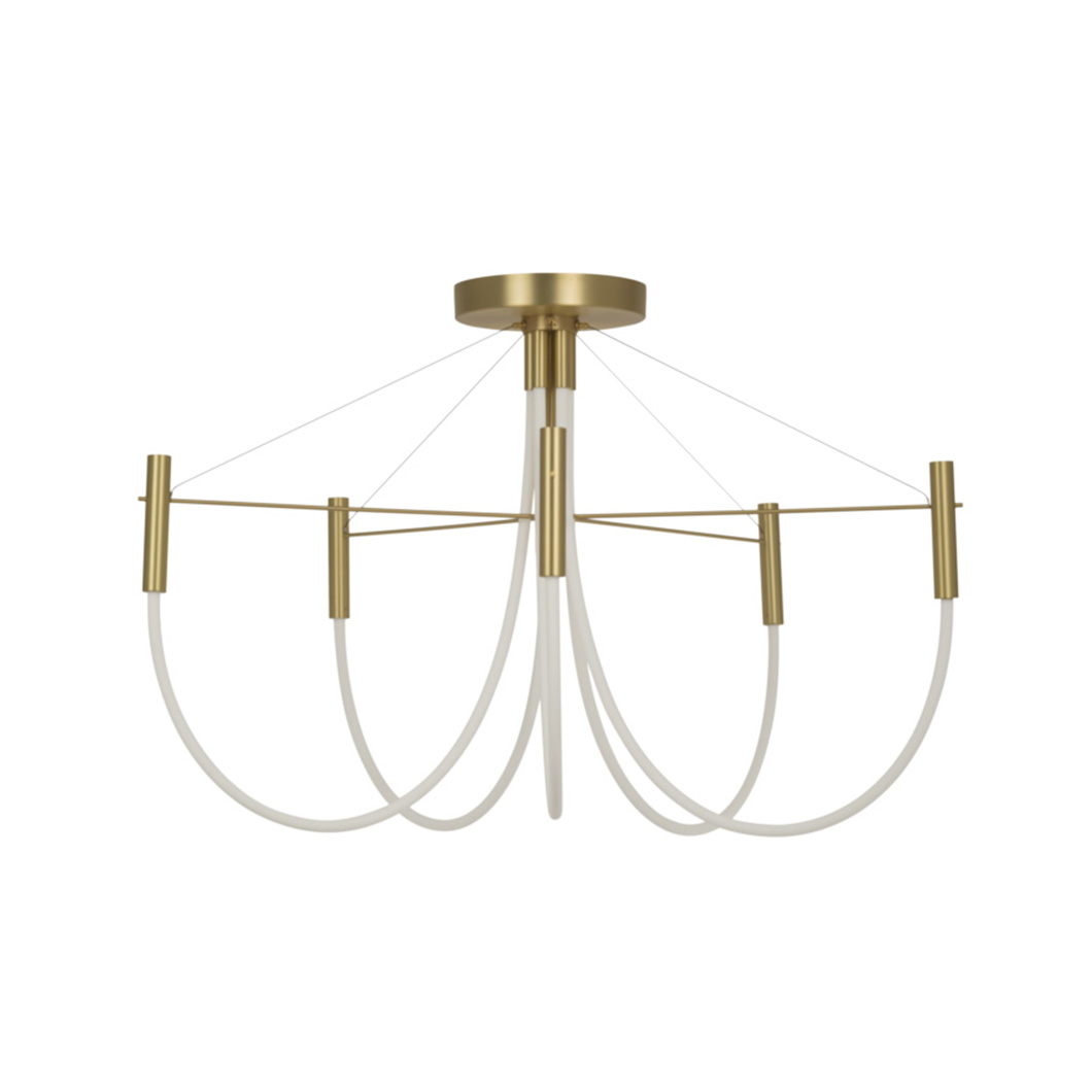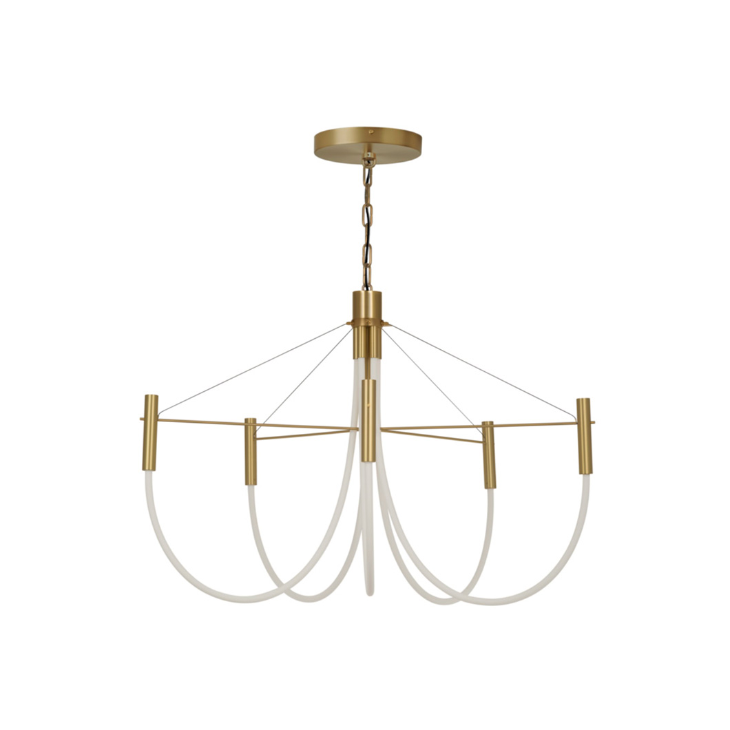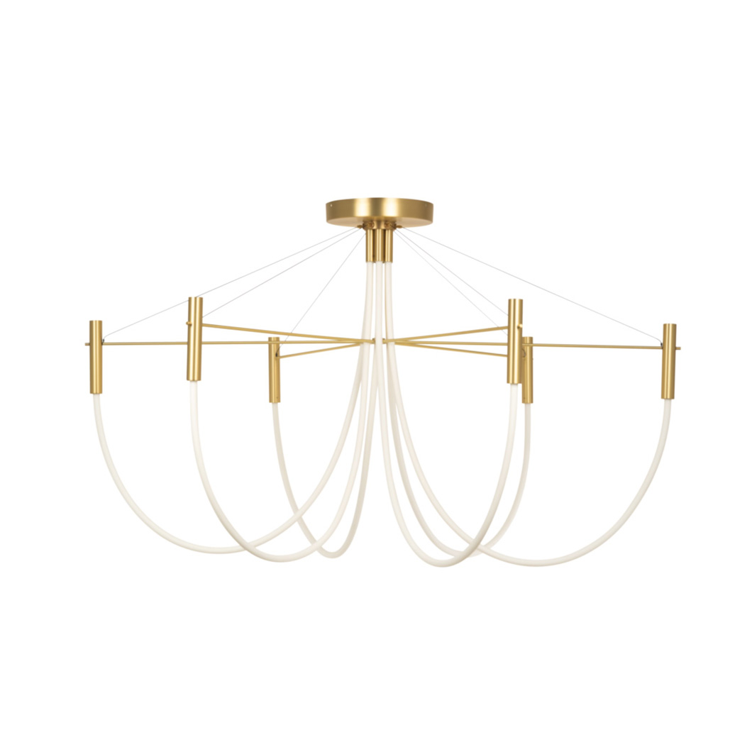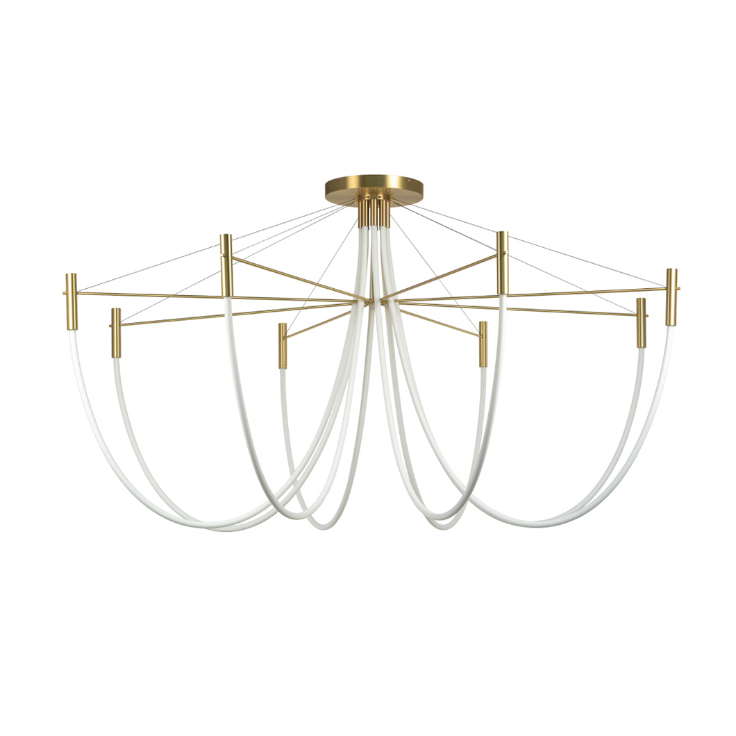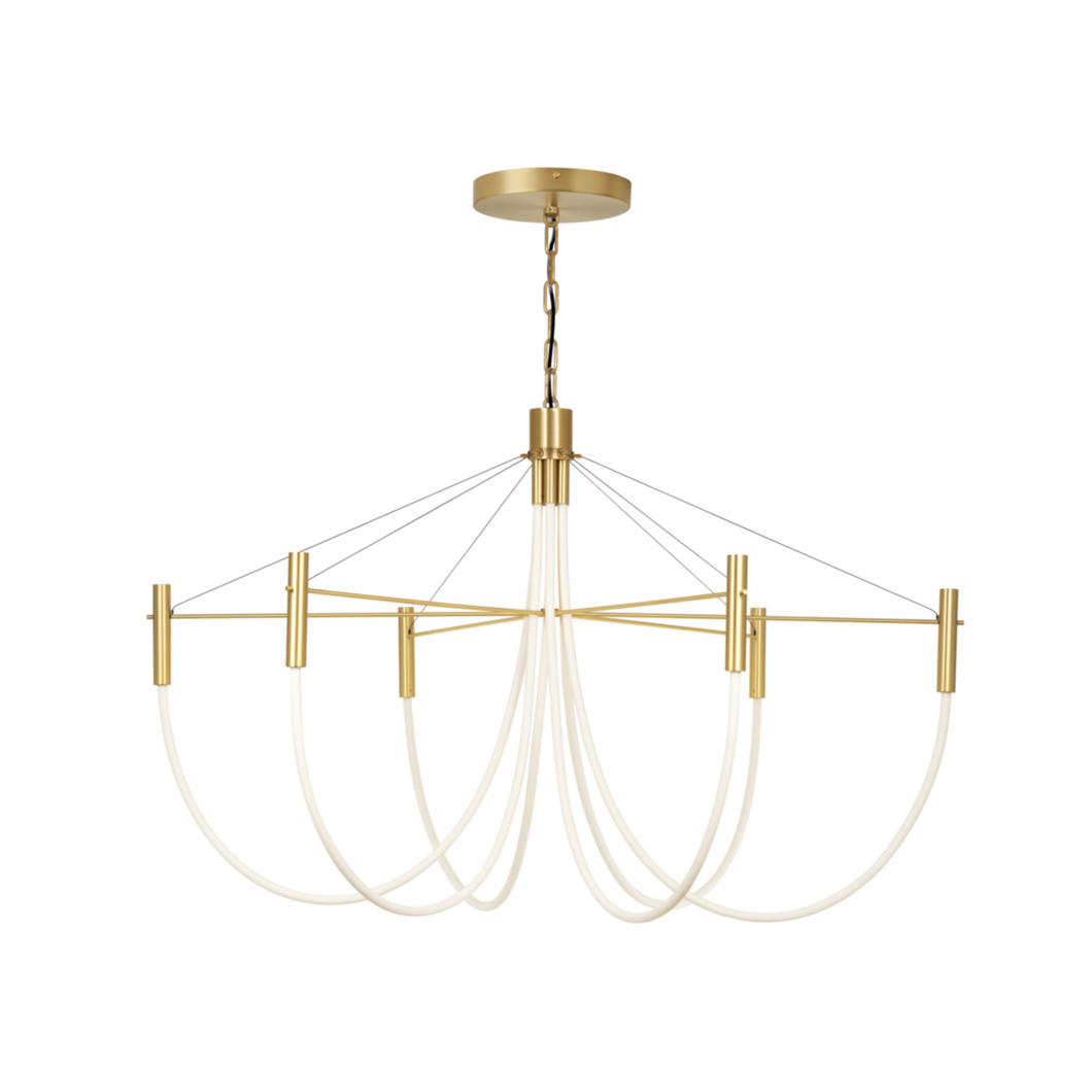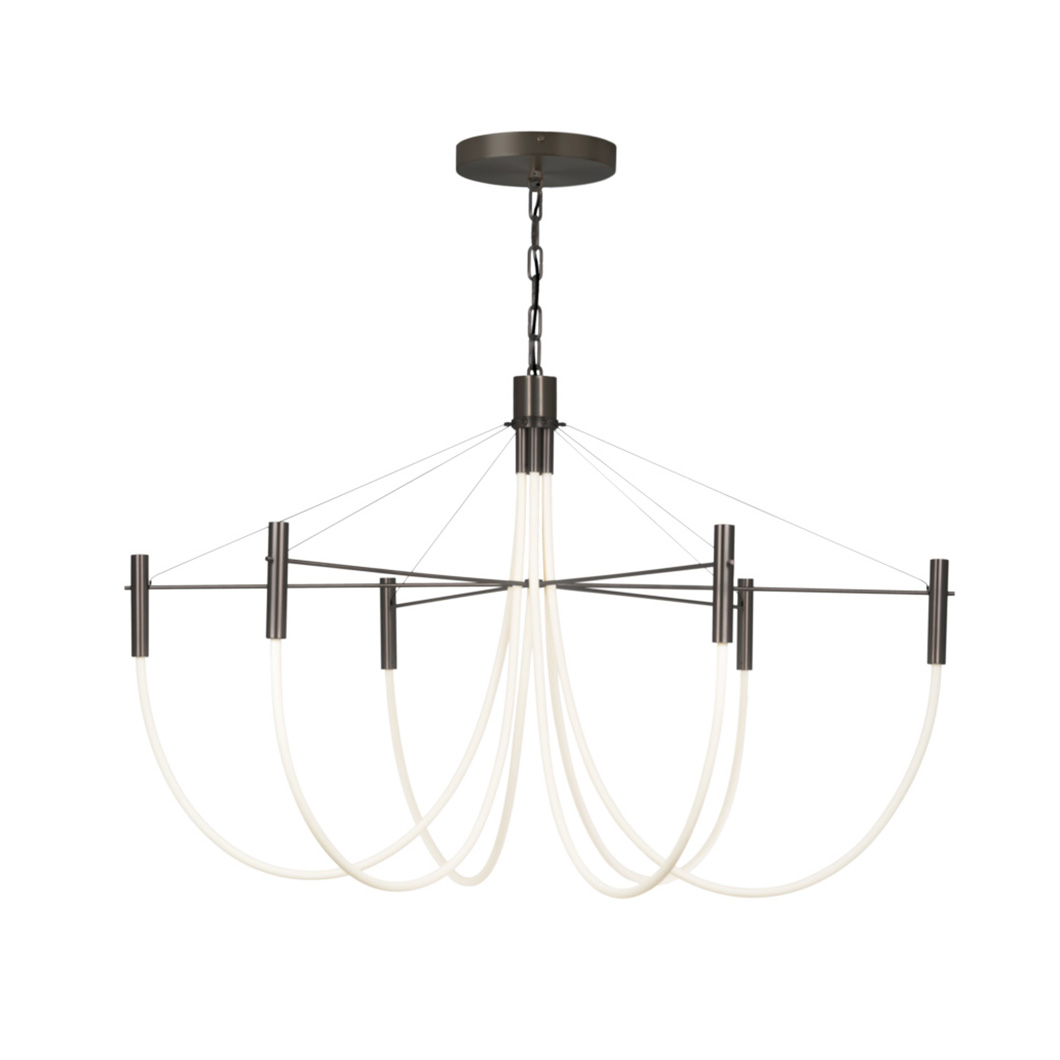The statement chandelier is available in four metallic finishes: brass, copper, graphite, or nickel. Each finish offers a distinctive look to match a range of interiors. Paradoxe comes in three different models, offering 5, 6, or 8 illuminated arms. Each variant also offers a fixed stem version or a longer chain version, depending on the size of your space. Paradoxe is supplied with an integrated LED that diffuses a soft 2700K glow. This chandelier is phase-cut dimmable.