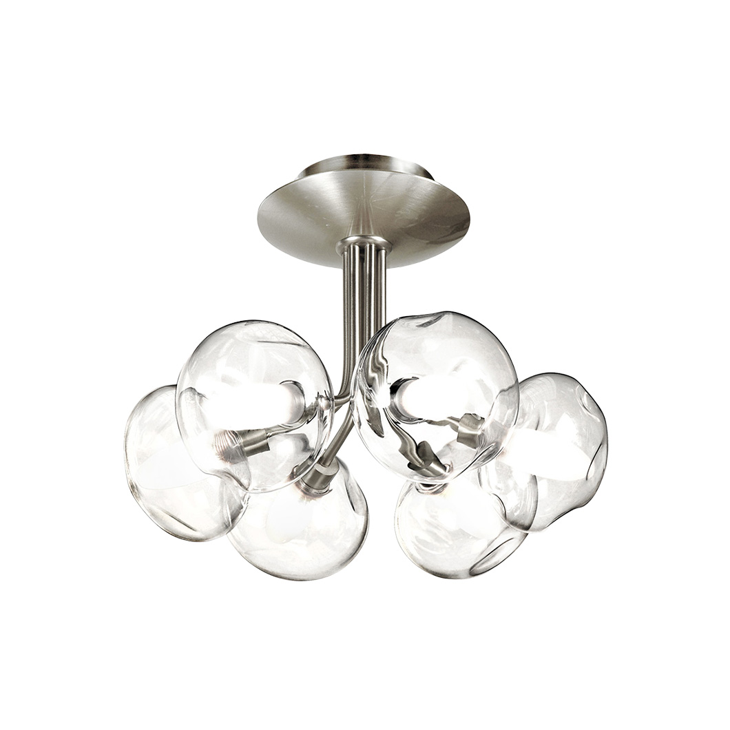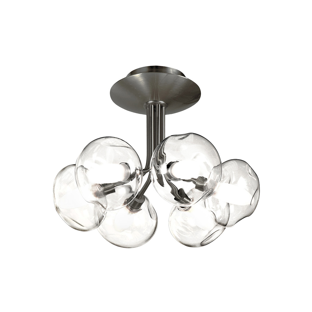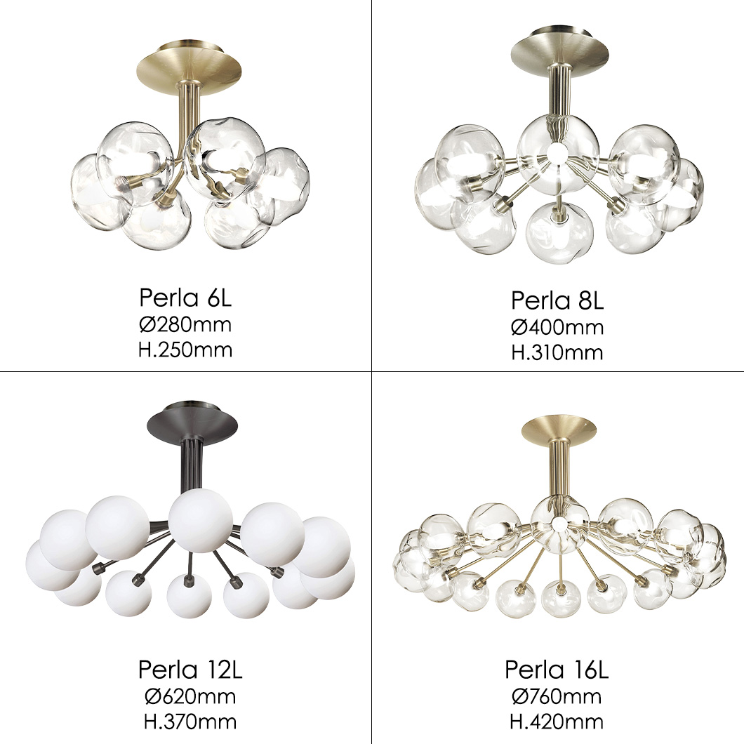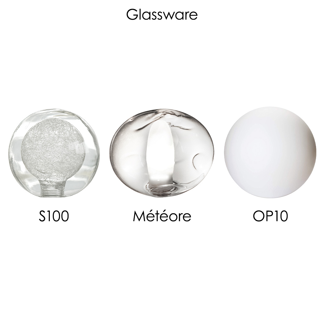 Choose between three stylish finishes for the metal structure: bruni, satin graphite, or satin nickel. Perla is also available with three glassware variants, offering both clear and opal white options: S100, Météore, or OP10. Light sources not included.