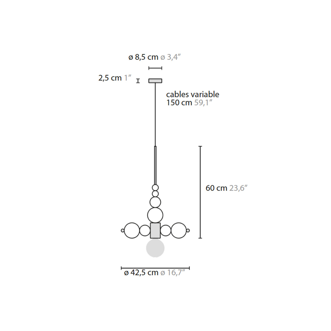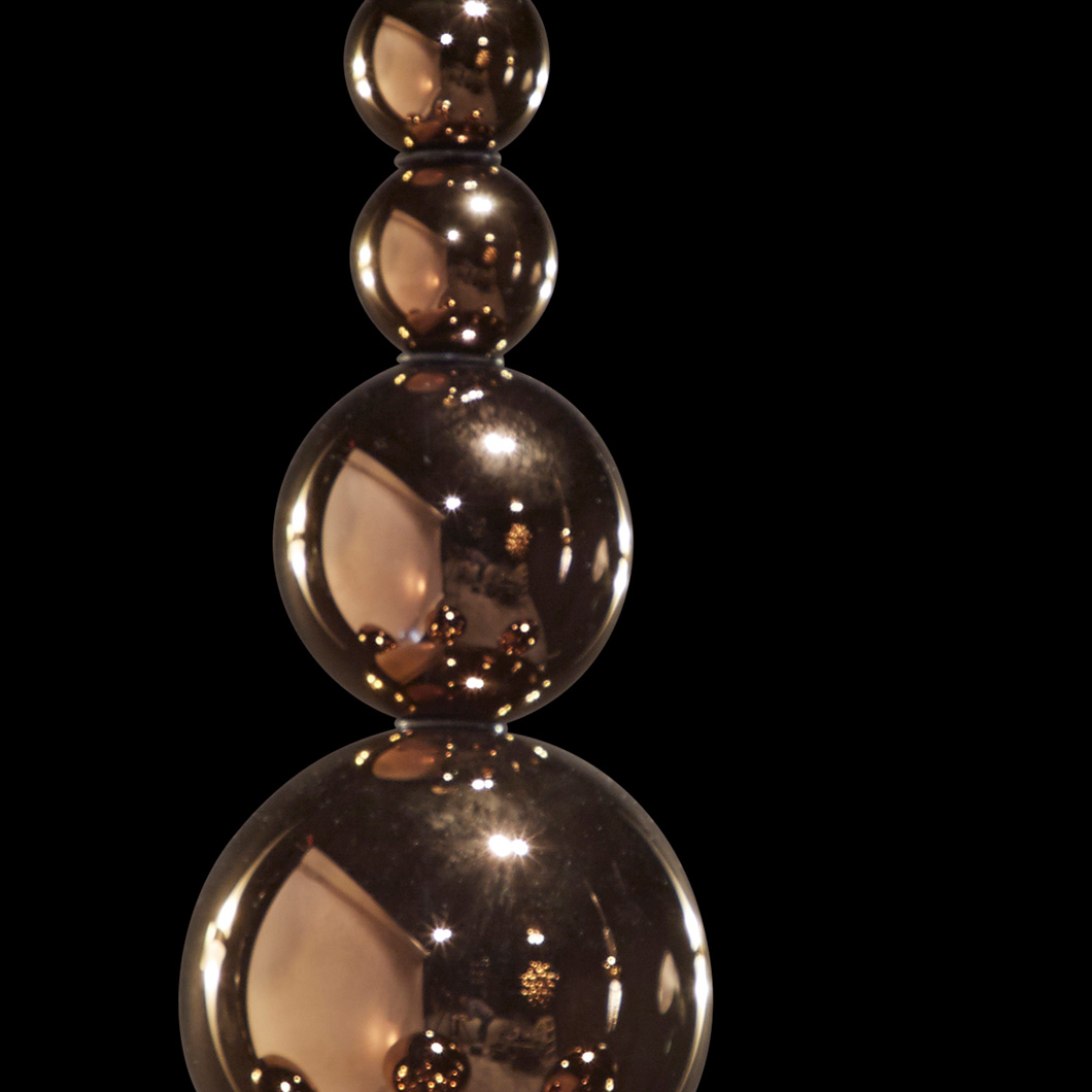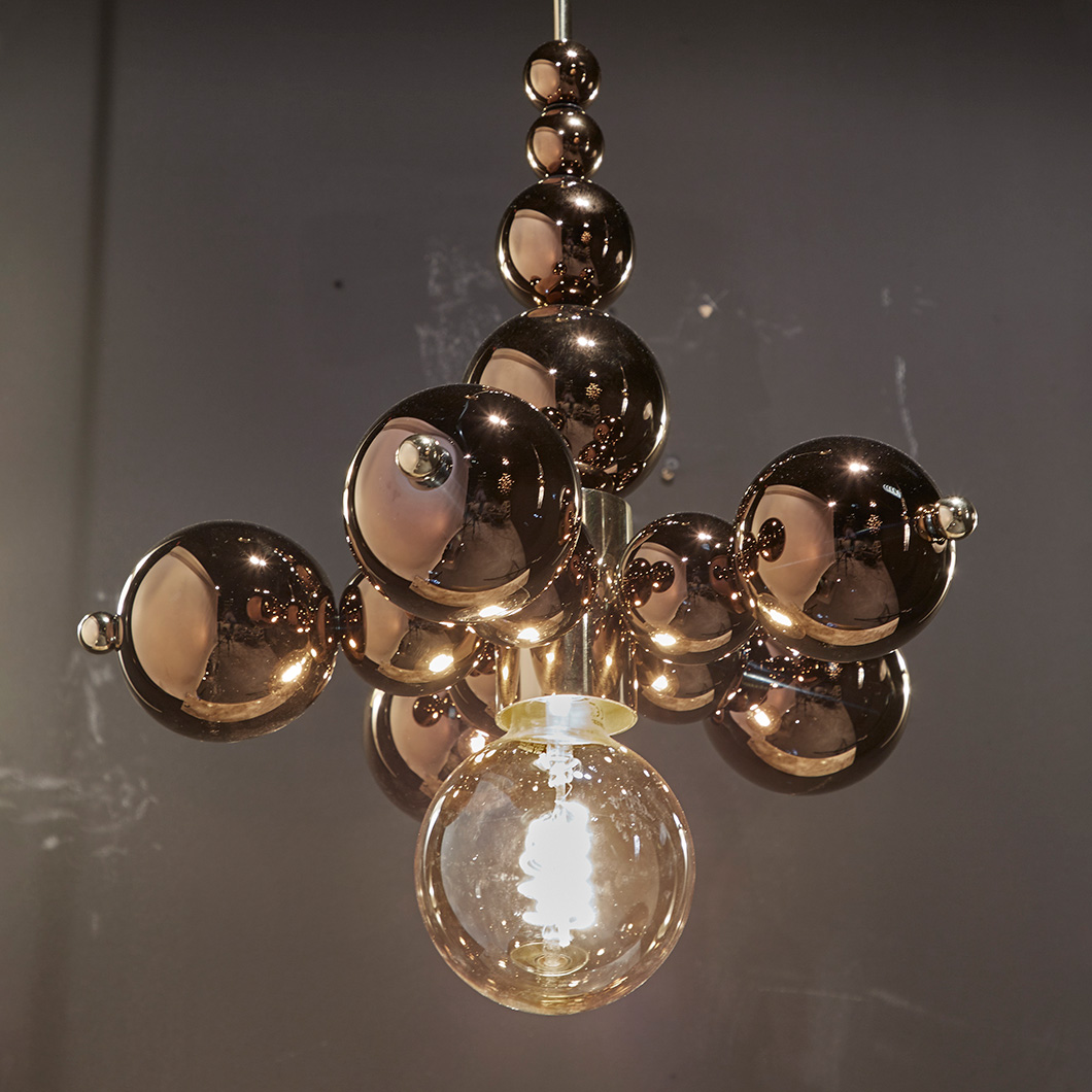 The stylish drop light has a distinctive composition made up of glass balls of varying sizes, all with a chic metallic finish. Choose between gold deore plated or chrome plated glass spheres to adapt the pendant to your space. Additionally, select a complementary finish for the pendant's metal frame: polished or satin brass, chrome, bronze, matt black, or matt nickel. Coral is supported by 1.5m cables, adjustable to suit the needs of your interior.