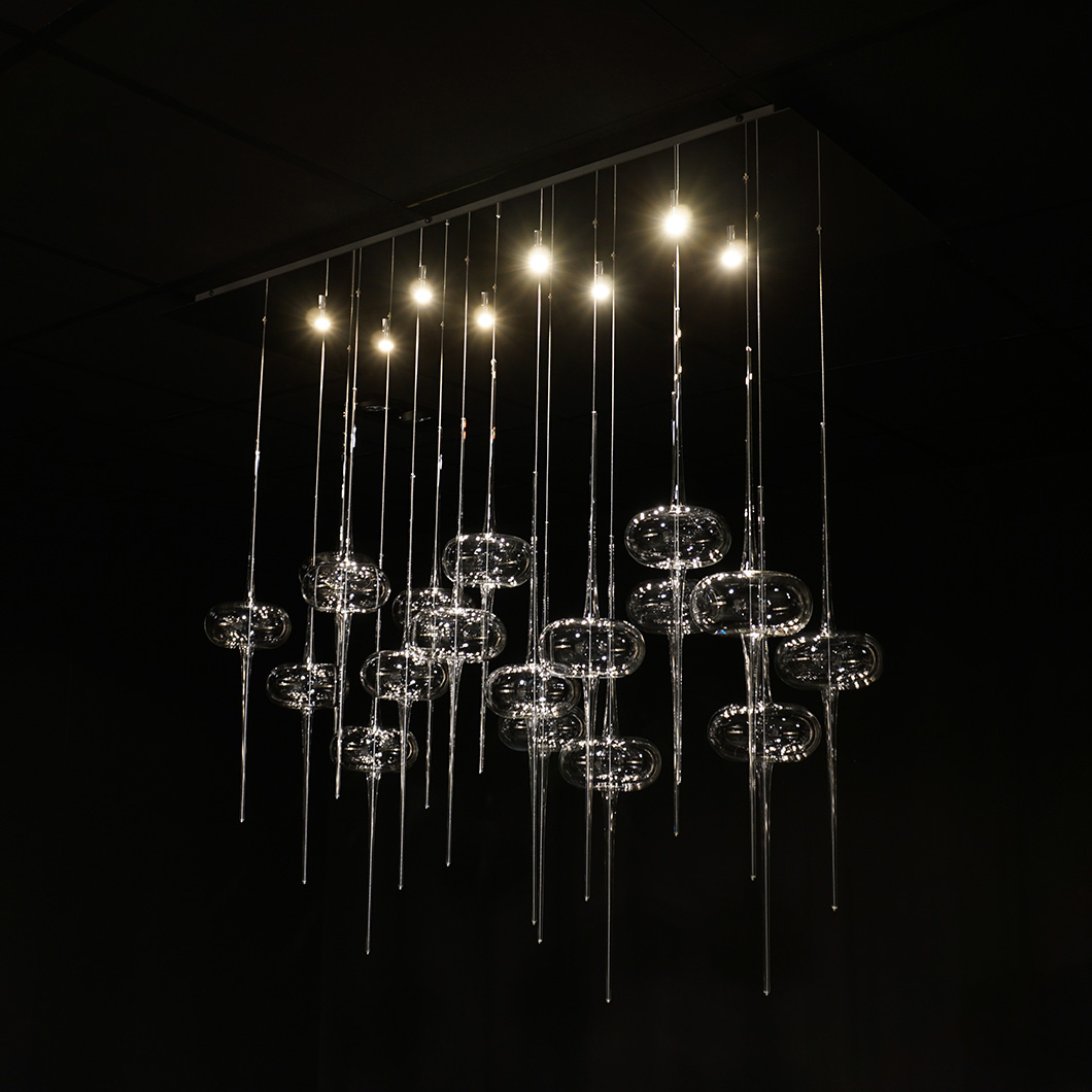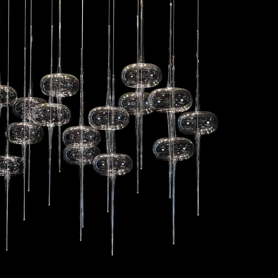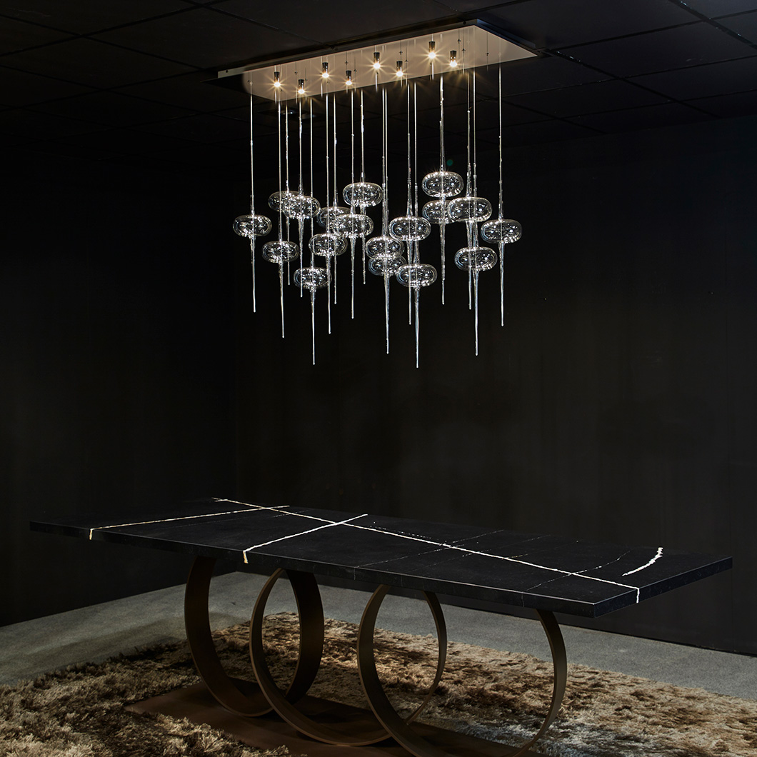 A brilliant composition, Encounter combines a myriad of elongated glass elements suspended from a rectangular ceiling base. The metallic canopy is available in three sleek finishes to complement the chandelier: chrome, matt black, or matt white. Encounter’s grand dimensions make it a stunning statement piece that will accentuate a lavish space.