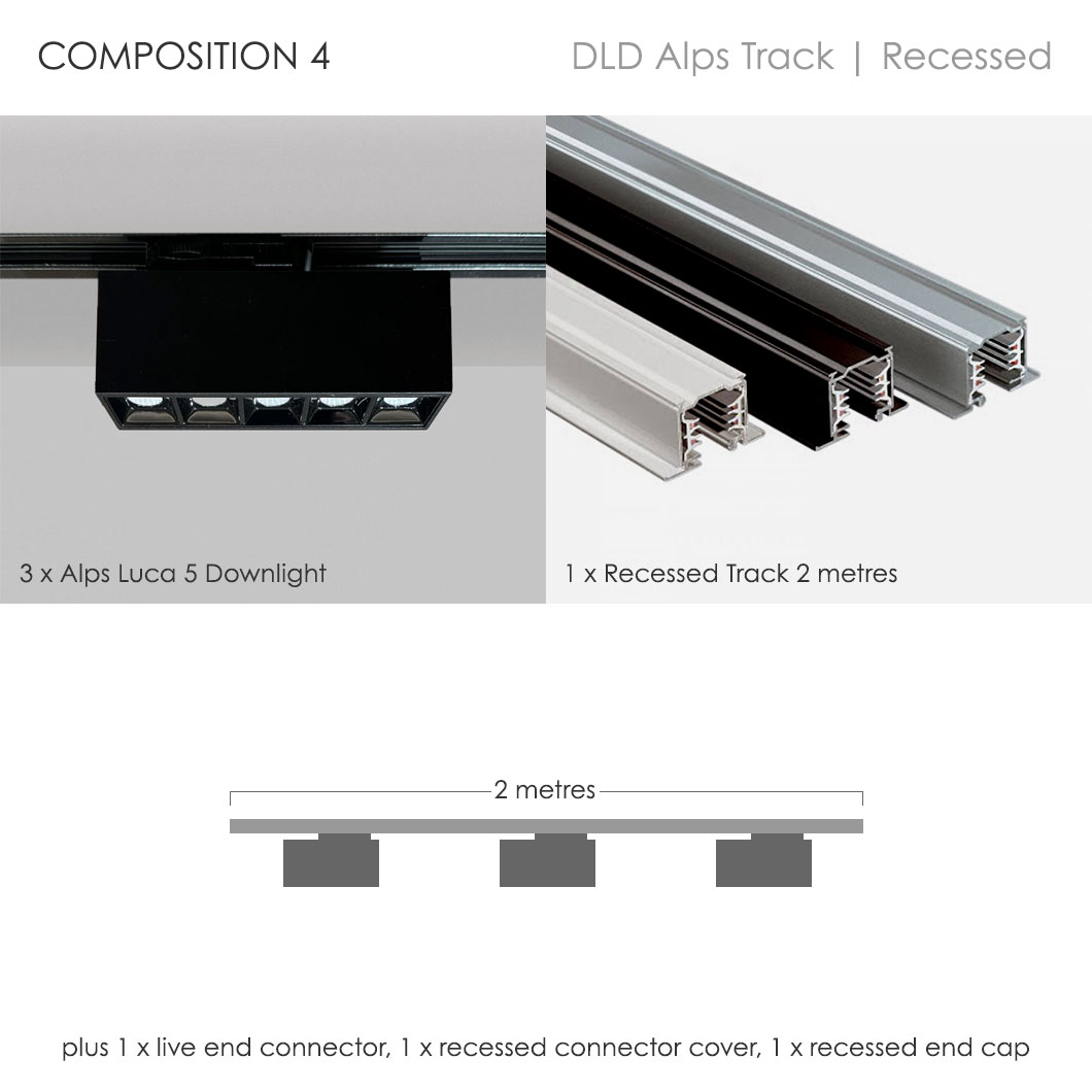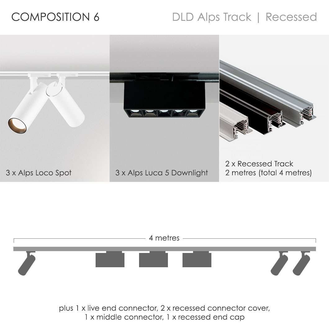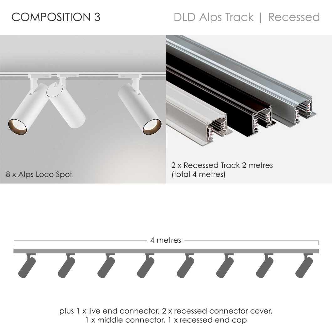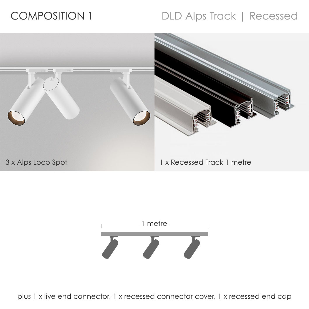 If you're confused by the endless combinations of architectural track lighting systems, you've come to the right place. Browse our pre-set compositions for our DLD Alps recessed track lighting collection. Our very clever lighting design experts have created 6 contemporary track packages, based on our most requested configurations. Minimalist in style and ideal for both residential or commercial use, our Alps packages take the hassle out of track lighting. Our sleek recessed track option is perfect for installation where the track needs to be hidden into the ceiling - this is easiest to achieve at the beginning of projects but our recessed track can also be retrofitted. For a no fuss option check out our Alps surface mounted track system packages.