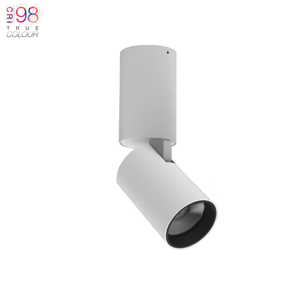 The surface mounted spot variation contains a large cylindrical base, containing the integral driver, which allows for easy installation. As well as a 355-degree rotation, the head is adjustable by a 90-degree tilt for you to freely change the direction of light, whether you want it facing straight down onto a worktop or pointing towards pictures, paintings, cupboards and more. With built in LED technology, choose between 2 power versions: 15W or 35W, 2 colour temperatures, and 3/5 beam angles to find the perfect light projection for a desired effect. Available in 3 finishes: matt black, matt white and brushed gold. Recess baffle in black. With 3 dimmable options available and also a non-dimmable option if not required. Integral driver included.