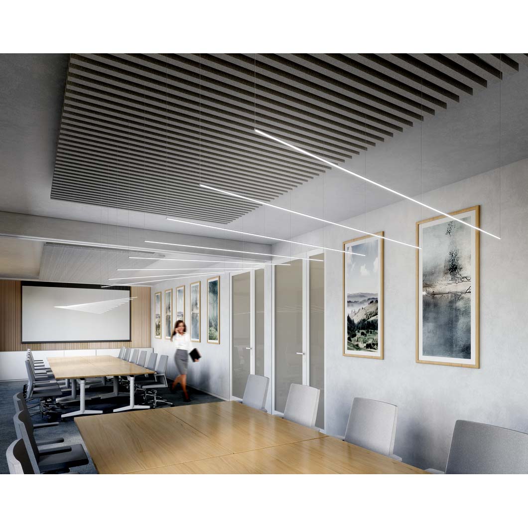 Supplied with a 5m reel of DLD Lightflow CSP 10W LED tape in 2700K or 3000K. With a width of 8mm, the Lightflow CSP LED tape can be installed in the profile (which has an internal width of 11mm) in a single line only. The included suspensions cable allow for a maximum drop of 5m, although this can be adjusted during installation. The power is fed through the suspension cables, so no need for an additional power cable alongside the fitting. Supplied with either a phase dimming driver or DALI driver. The driver is installed remotely from the fitting.