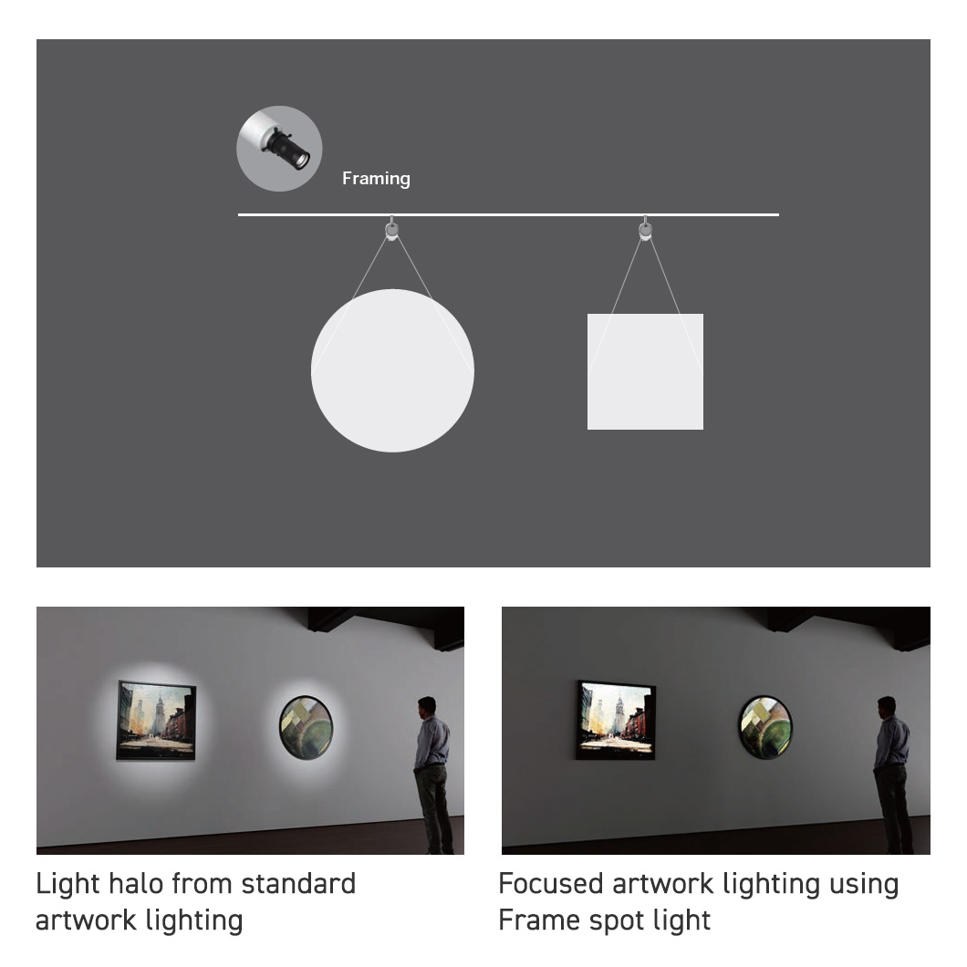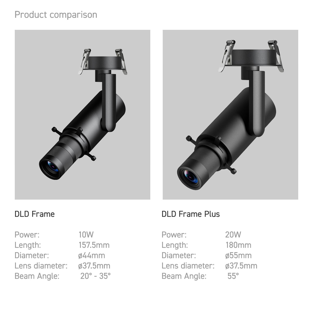 The higher power DLD Frame Plus semi-recessed spot is perfect for museums, galleries or for the home. Powered at 20W compared to the standard DLD Frame which is 10W, Frame Plus is specifically designed for lighting artwork from a greater distance. With an adjustable tilt of 90° and rotation of 355°, the DLD Frame Plus also boasts a wider 55° projection beam angle. Baffle and lens unit in black, whilst the body and housing is available in black or white. Choose from warm white 2700K or cooler white 3000K colour temperatures depending on usage.