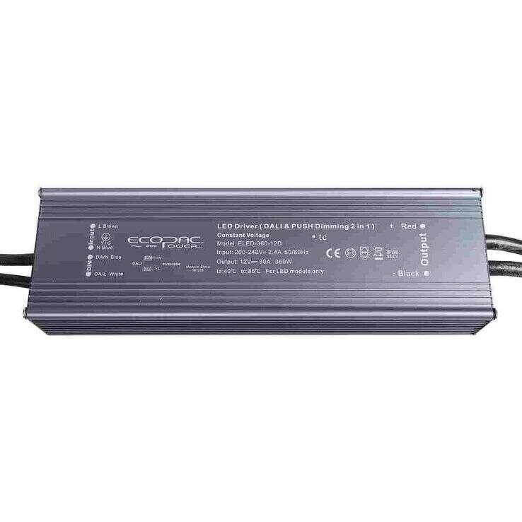 ELED-360-24D is a constant voltage mode output LED driver. This driver supports DALI dimmers. For more technical info, please see the datasheet in the Downloads tab below.