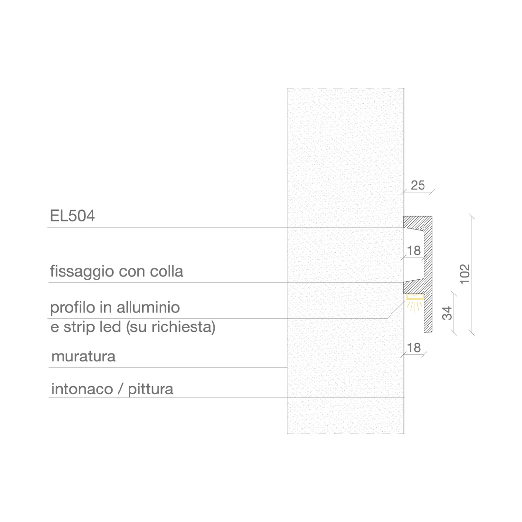 Designed for washing walls with a soft light, the Eleni EL504 is a linear profile with a wide and square surface mounted cornice. The Eleni EL504 cornice can be used to create an outline of light around a door frame or to uplight a ceiling or wall, perfect for creating striking yet subtle lighting effects. For architects and lighting designers looking to create an ambient wall washing lighting effect that is integrated into the architecture, this wide squared profile is made from polyurethane (PU) and finished in a acrylic resin that can be painted.