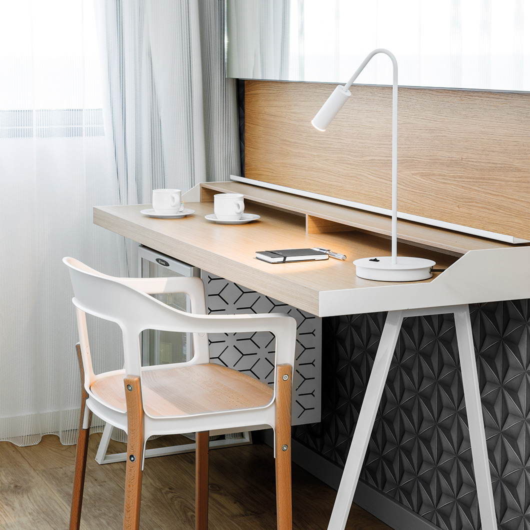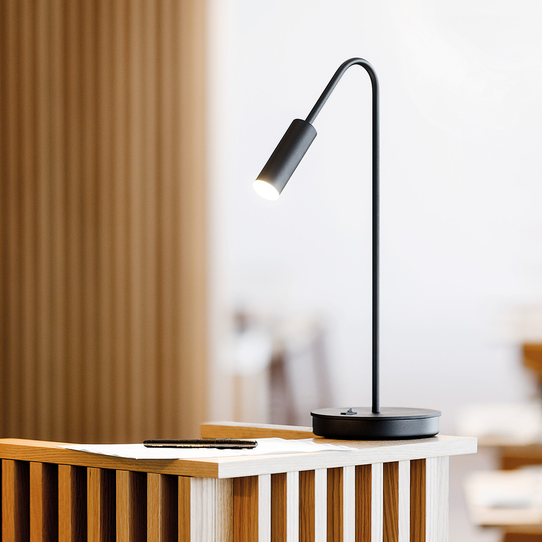 Volta is available in three stylish finishes, each offering a modern look that matches the minimalist design. The slender fixture is available in all black, all white, or with a black body and satin gold lamp head for an added layer of luxury. Place Volta on a desk in a home office or study to illuminate the workspace. Or, use Volta as a pair of bedside table lamps in a contemporary bedroom.