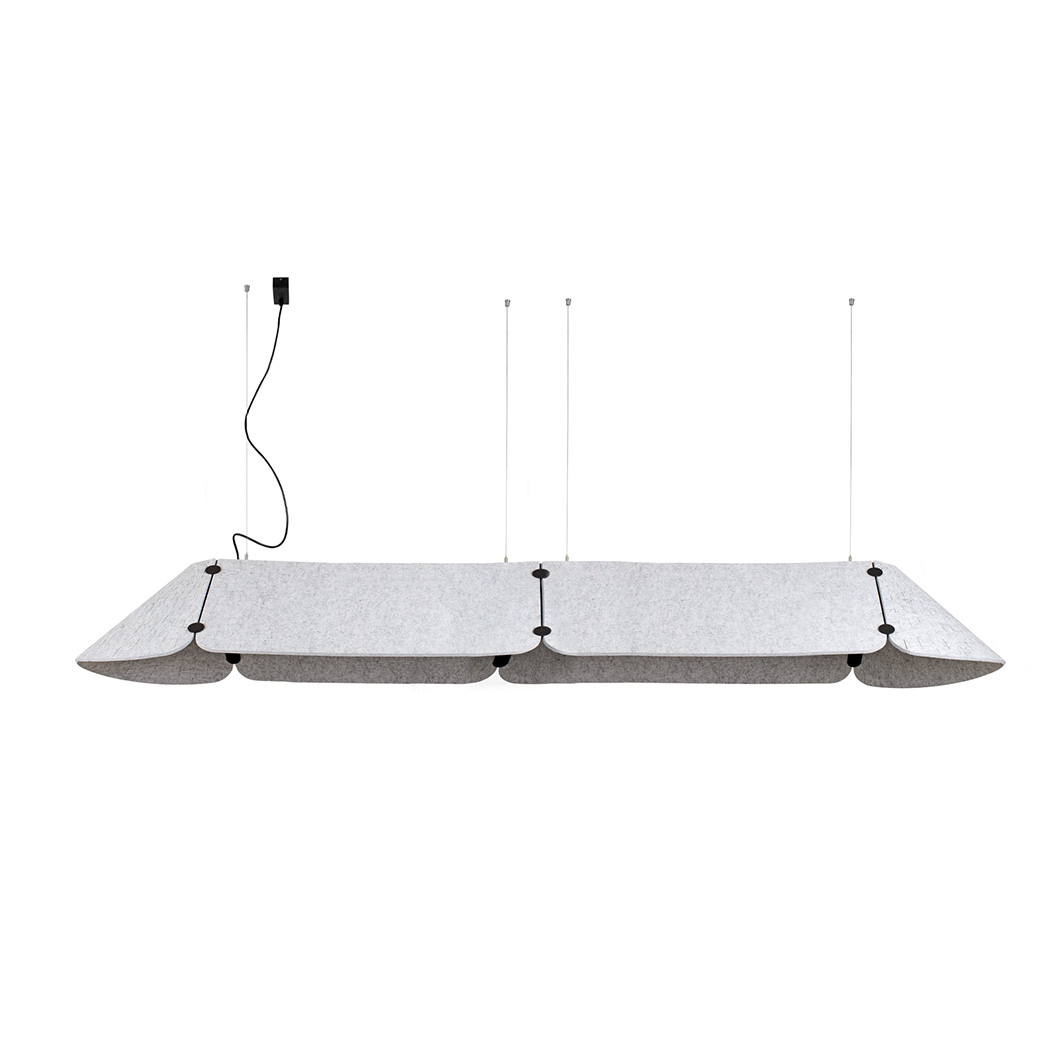 With panels made from recycled PET Fonovia obtains absorbent class A and has a sound absorption coefficient (α) of 0.90 whilst also being environmentally friendly. A perfect complement to decorate and illuminate offices and open common spaces. The light source is 50W SMD LED, with a light colour temperature of 3000K or 4000K.