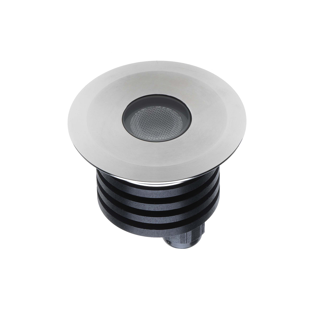 Flexalighting Fatboy 2 Round LED IP67 in-ground recessed floor uplight boasts high construction quality and excellent optical performance. The use of advanced waterproofing technologies ensures absolute product reliability. Anodized aluminium body with double powder coated aluminium front finished in Grey, Black or COR-TEN. Front also in stainless steel AISI 316L. IP67 and IK09 ratings mean this fitting can be used outside (with recessing box CSFB01) and is strong enough to take the weight of a human. The stainless steel finish is IK10 rated, which means it can be driven over.