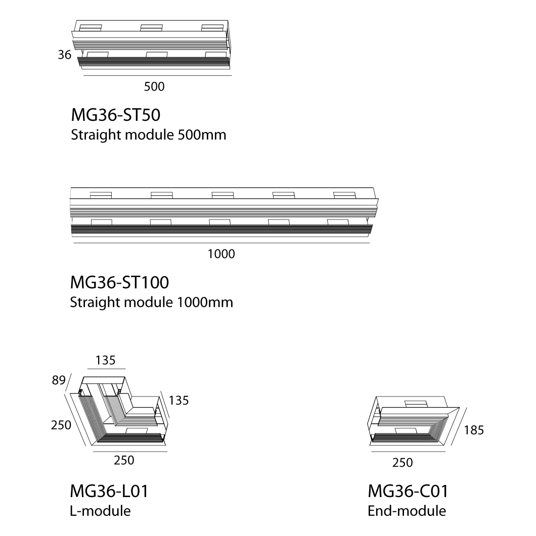 Flexalighting Maggy 36 trimless recessed linear track system utilises 4 components to create flexible tailored installations. Available in 2 straight lengths - 1000mm and 500mm, with an L-module for corner connections and and end module to cap the line.