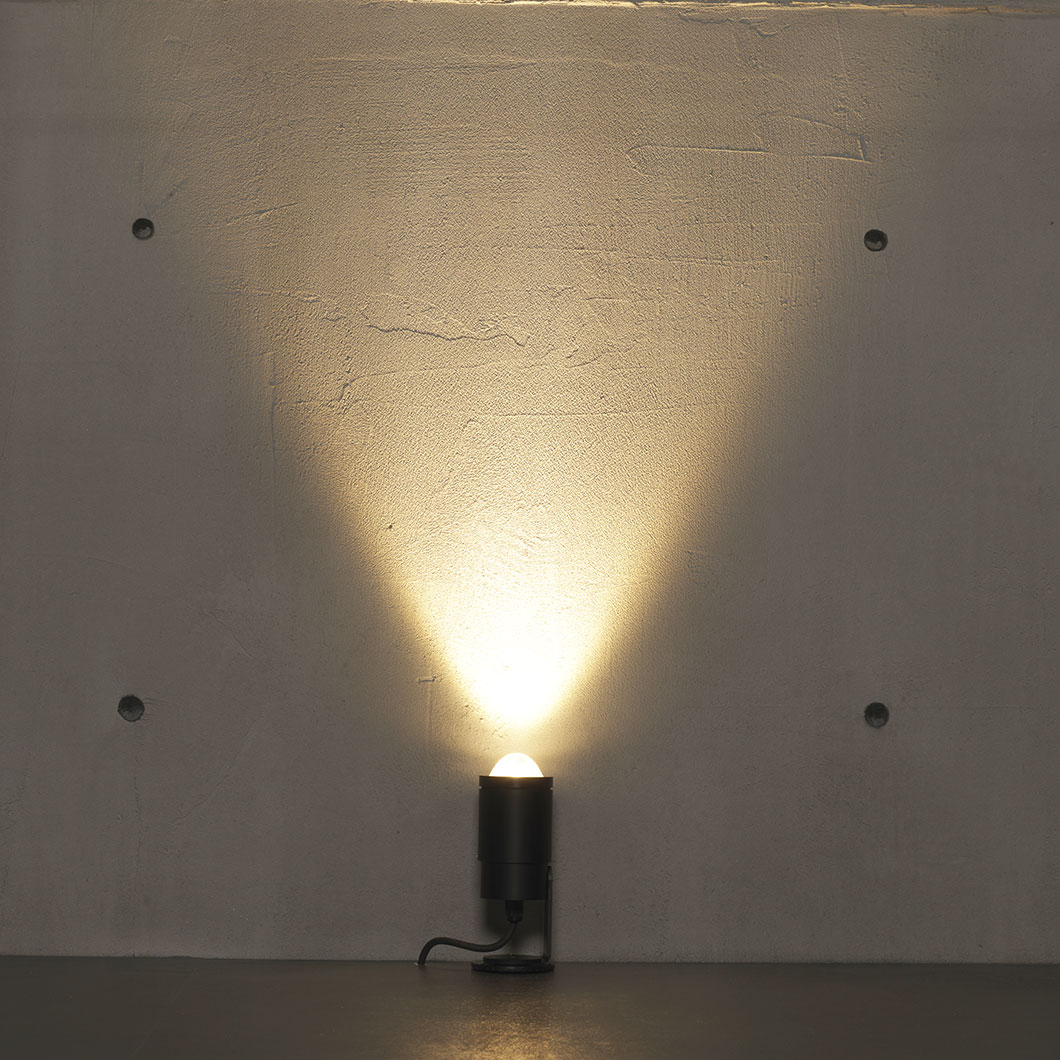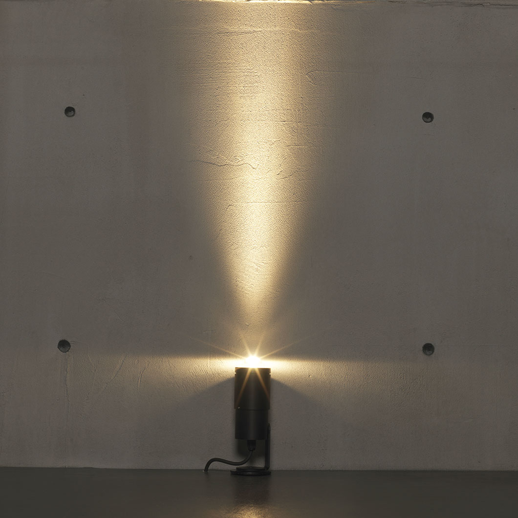 Zoom 10 IP65 adjustable outdoor spot light is the big brother of the Zoom micro-projector. The adjustable optics are made of anodised aluminium and suitable for installation in particularly aggressive exterior environments. Finished in aluminium, black or bronze. The width of the light beam is adjustable by turning the head of the fixture, ranging from a 10° narrow beam to a 55° wide beam. Optical quality and high-quality finishes come together in a highly reliable product. Can be installed directly onto the ceiling or wall, or into the ground with the optional earth spike (CP0022).