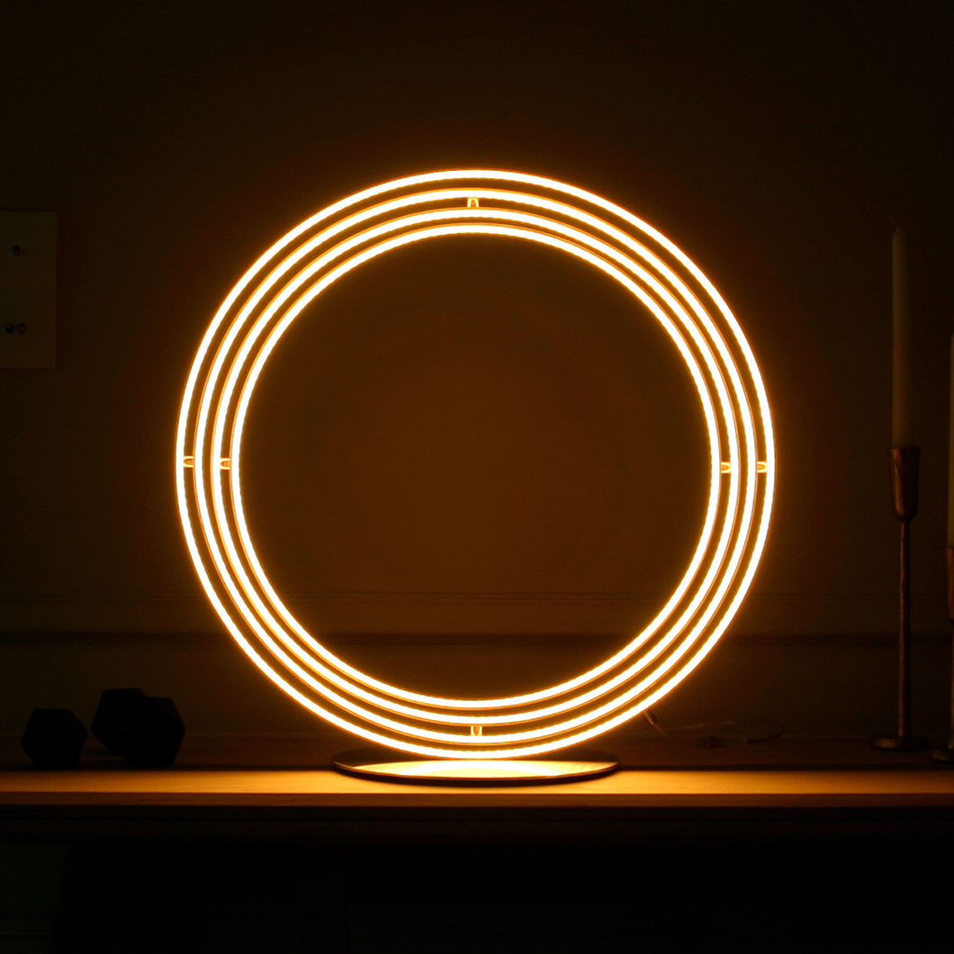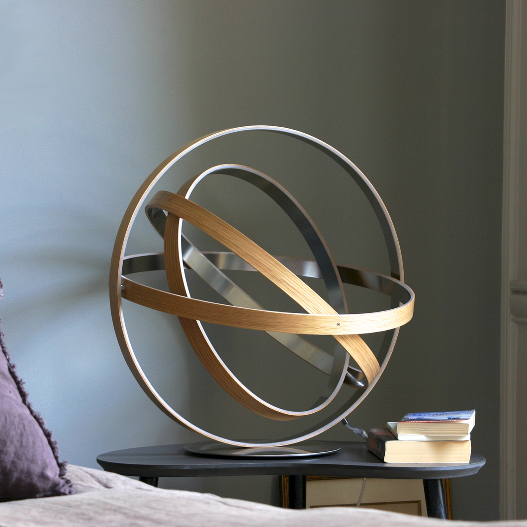The Henri Bursztyn _B612 creates visual magic through the mastery of invisible LED technology. Inspired by armillary sphere, 4 independent adjustable rings offer an infinite diversity of lighting angles. With a maximum lamp/user interaction the _B612 adjusts to one’s need or wish, creating a unique object. The _B612 comes as a table lamp with a wooden oak frame. For an ultimate comfort, the_B612's light intensities are dimmable with the use of a wireless remote. Choose between an amber (2400K), home white (2700K) or warm white (3000K) LED.
