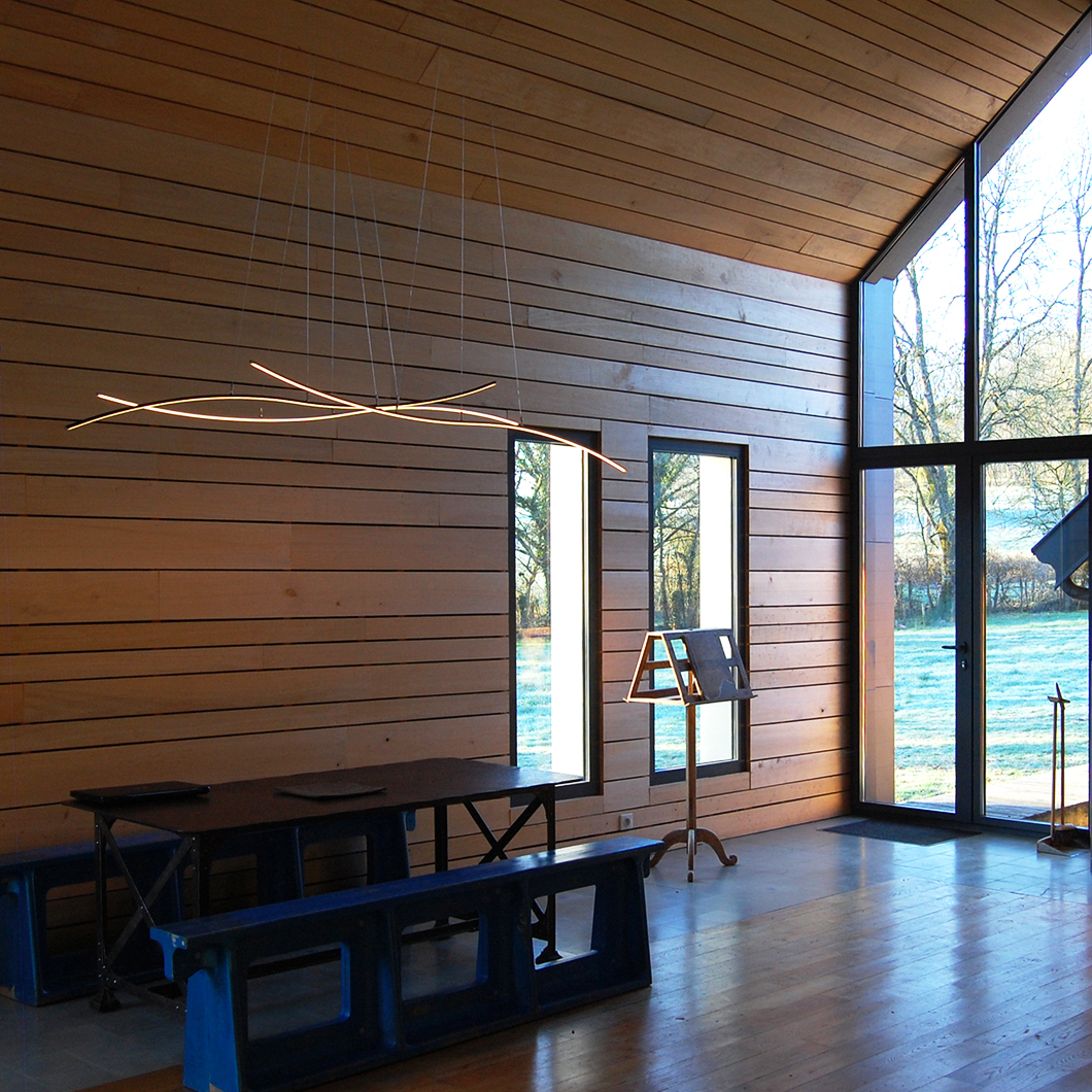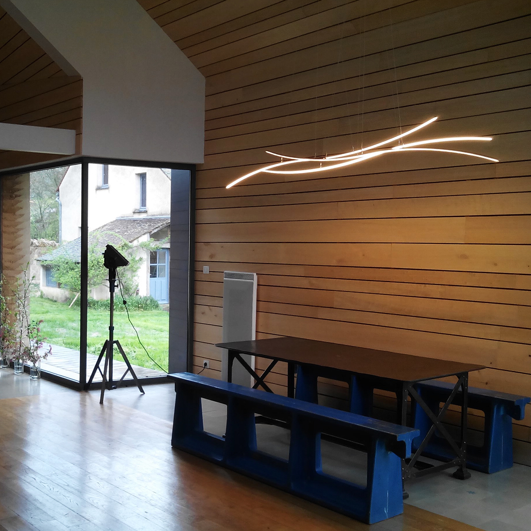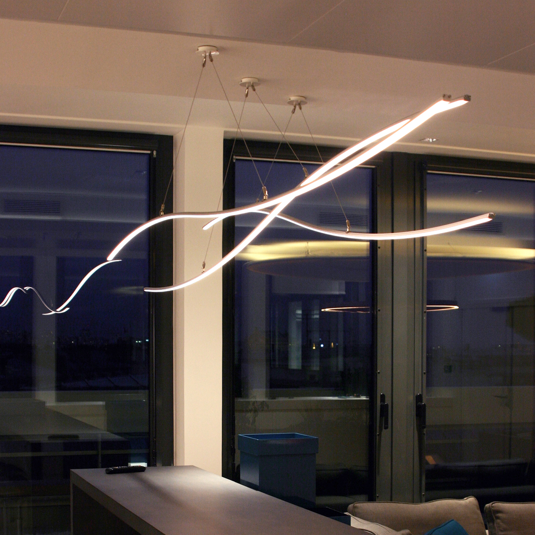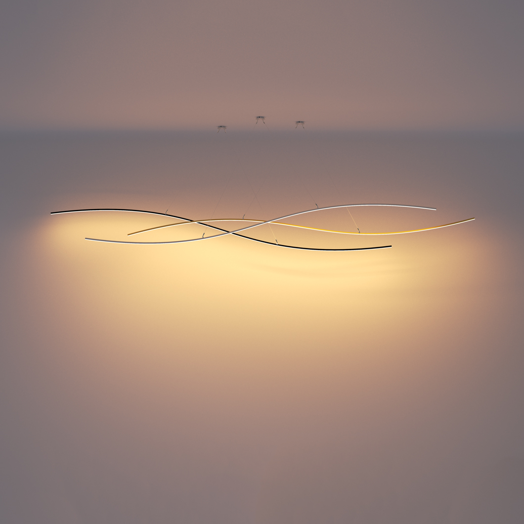 The Henri Bursztyn _Warp1 is a contemporary pendant made of ultra thin suspended luminous waves that can be infinitely duplicated. Inspired by the warp speed from Star Trek, the resulting minimalist suspension light system subtly suggests movement and is the perfect addition to an ultra modern interior scheme. The _Warp1 is powered by its adjustable suspension cables to emphasize the feeling of lightness. For ultimate comfort, the _Warp1 ‘s light intensity is dimmable and comes with a wireless remote control. Finished in black, silver, gold or white. Ceiling plate not included. Power supply to be installed remotely. Remote receiver included. Made from lightweight aluminium.