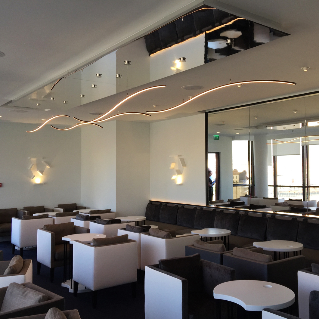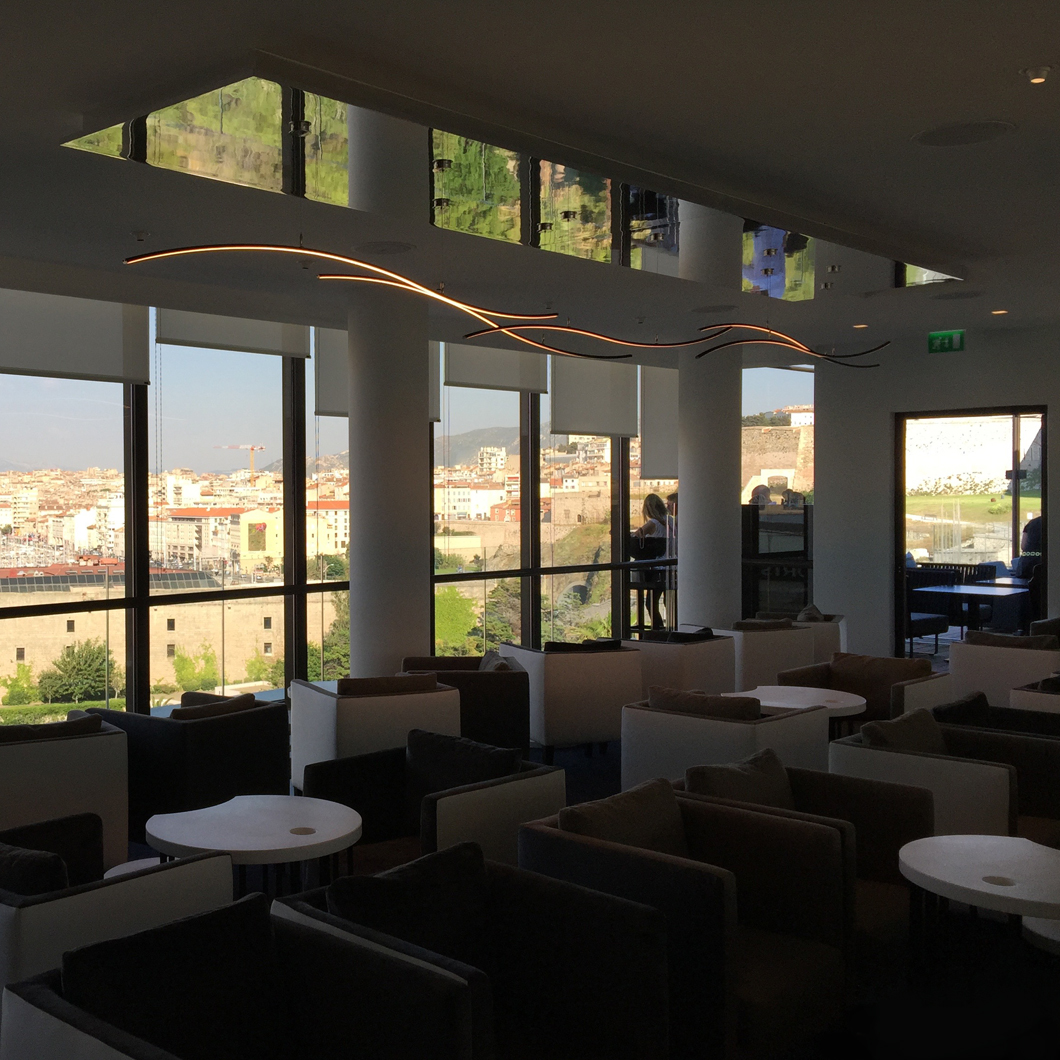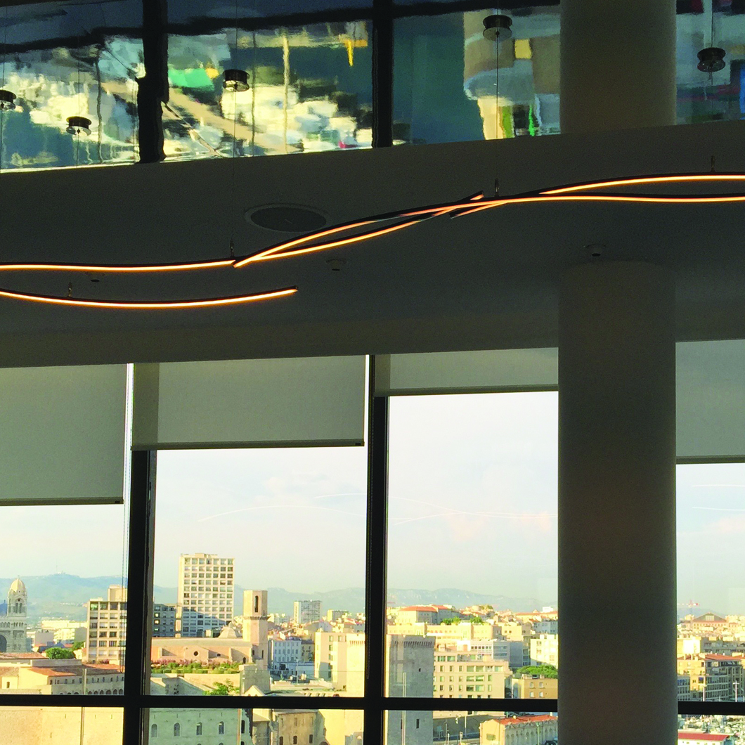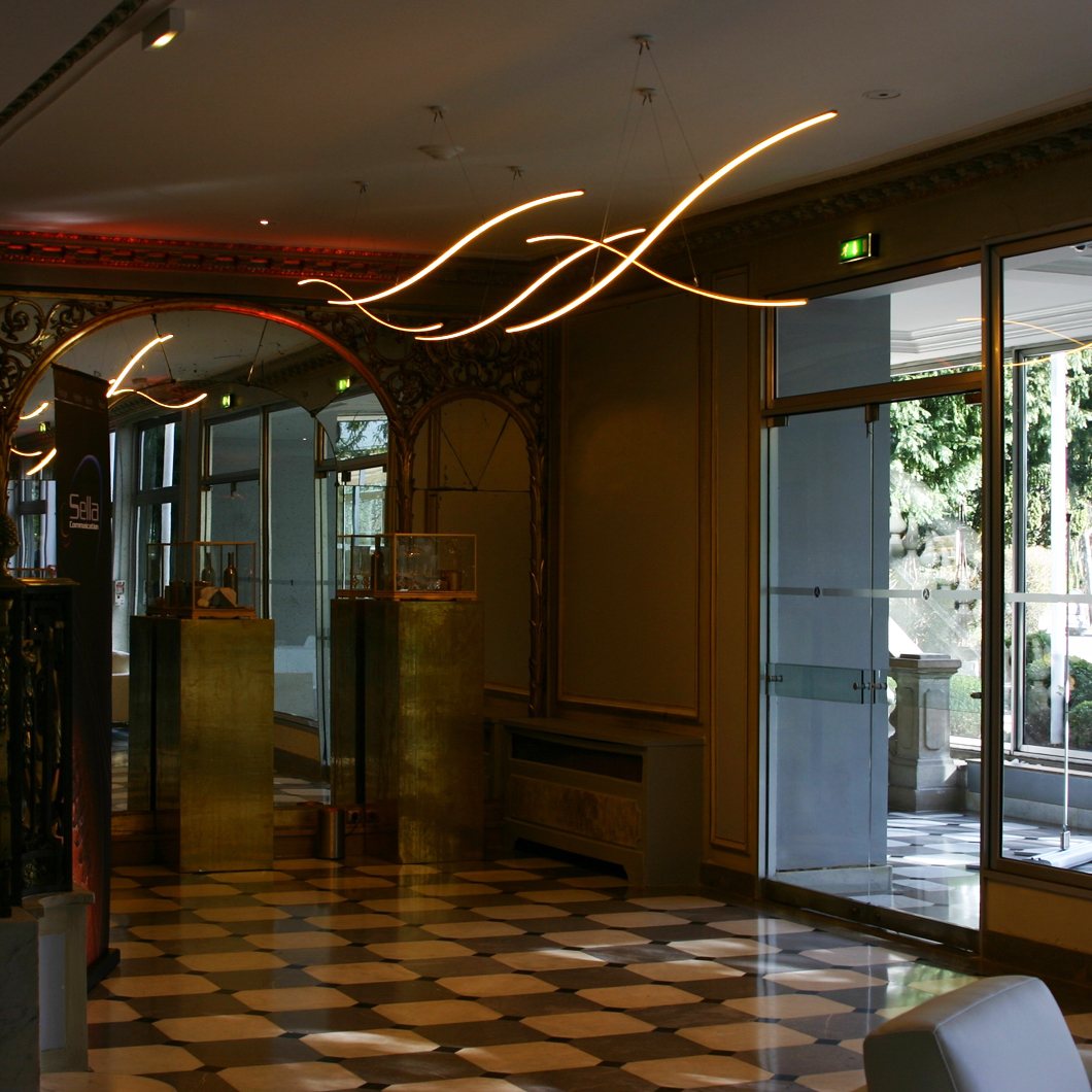 The Henri Bursztyn _Warp1 is a contemporary pendant made of ultra thin suspended luminous waves that can be infinitely duplicated. Inspired by the warp speed from Star Trek, the resulting minimalist suspension light system subtly suggests movement and is the perfect addition to an ultra modern interior scheme. The _Warp1 is powered by its adjustable suspension cables to emphasize the feeling of lightness. For ultimate comfort, the _Warp1 ‘s light intensity is dimmable and comes with a wireless remote control. Finished in black, silver, gold or white. Ceiling plate not included. Power supply to be installed remotely. Remote receiver included. Made from lightweight aluminium.