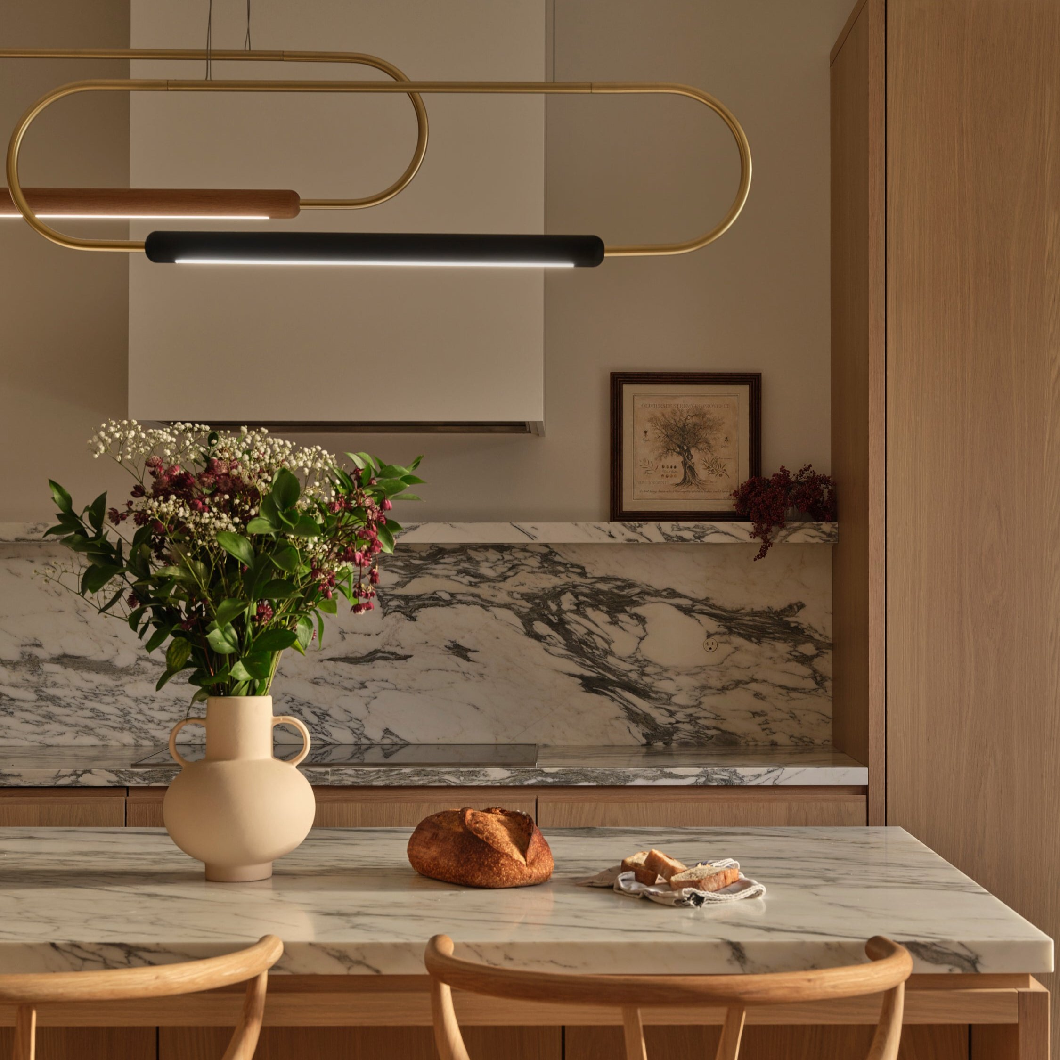 The integrated light source delivers an even, diffused glow along its length, making it ideal for dining tables, kitchen islands or collaborative spaces. With its measured proportions and material honesty, the Horizontal Link Pendant offers a confident yet understated presence, embodying the brand’s commitment to craftsmanship, clarity and enduring design.