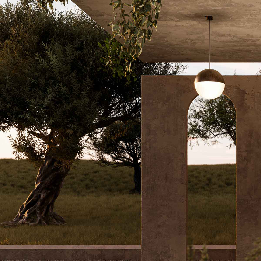 Exhibiting timeless elegance and rustic charm, the Sfera Outdoor Pendant is the ideal decorative accent for your exterior lighting scheme. The sophisticated suspension light takes on a minimalist form, effortlessly elevating an outdoor area with its sublime material mix.