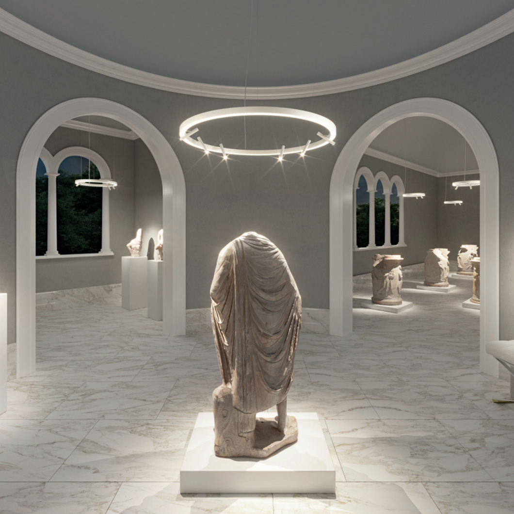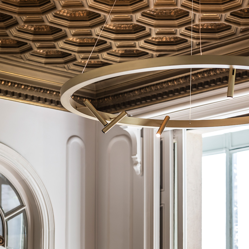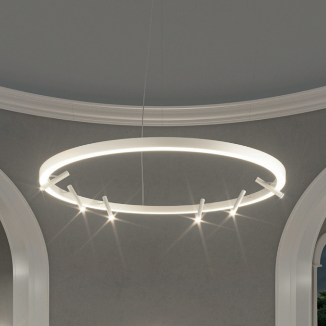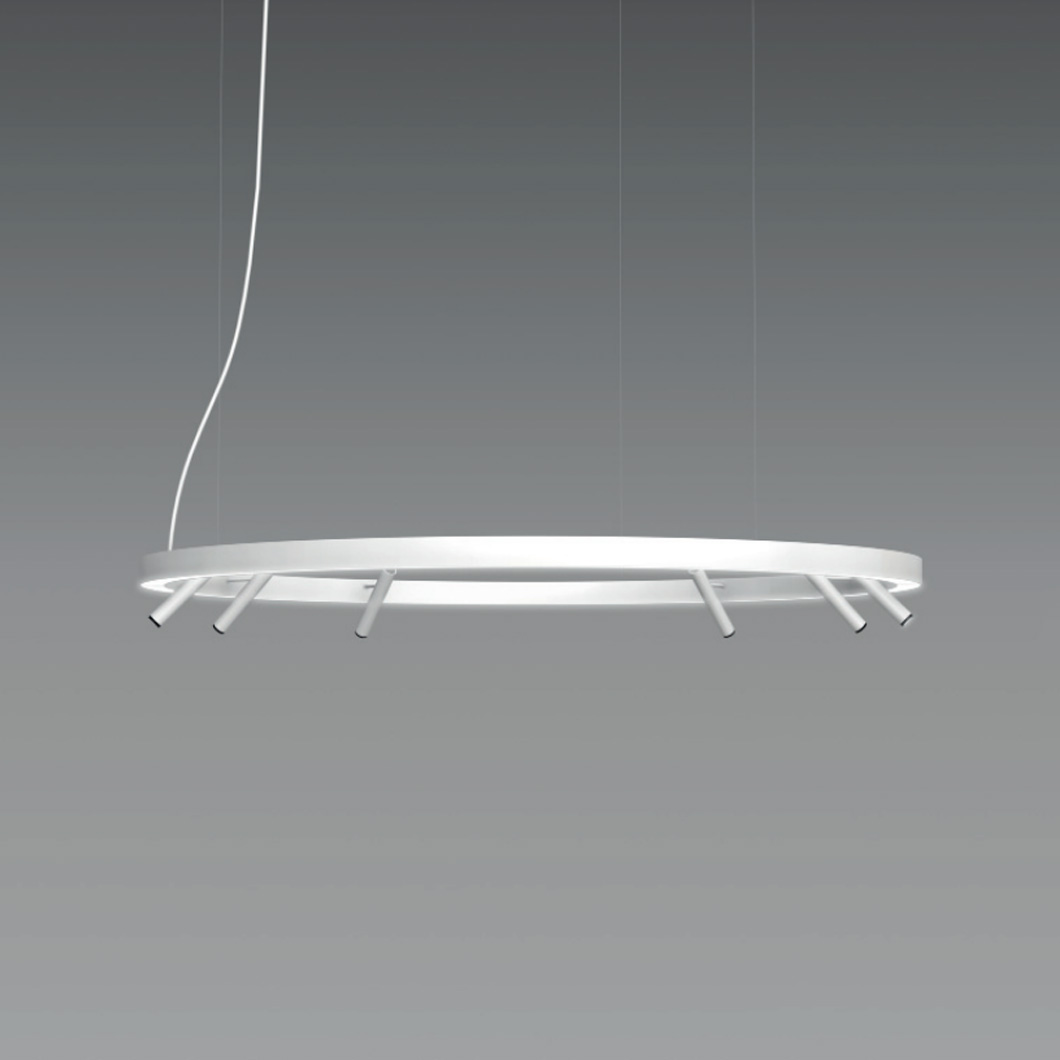 Made of an extruded aluminum profile with an opal polycarbonate diffuser, this drop light emits a soft, diffused brightness from its downards LED source, complemented by the focused downward spotlights.