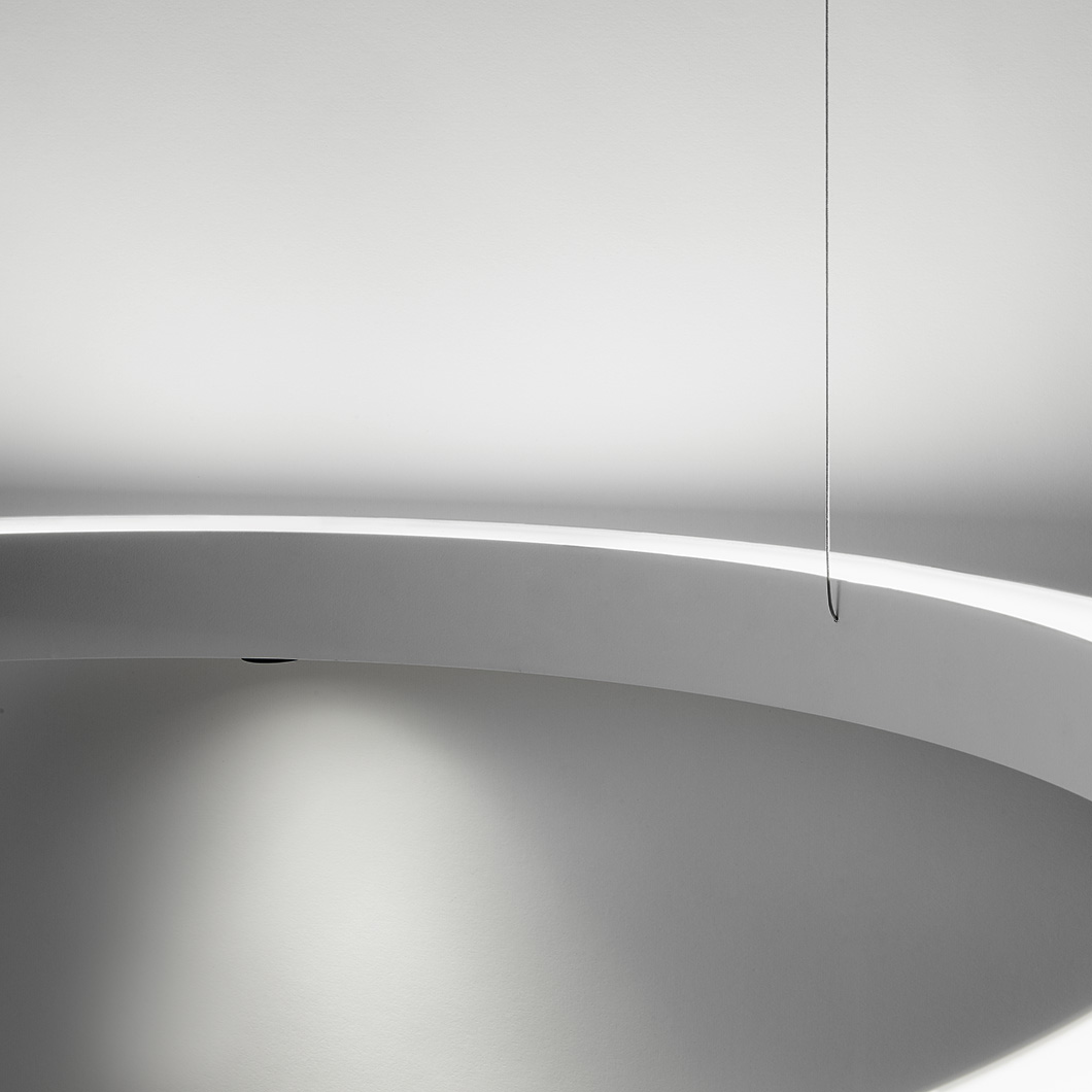 Three adjustable stainless steel cables support this graceful suspension light, making for easy installation both in a modern dining room or in a sophisticated home office. The range of finishes and simple design of the TR 500 Spot & Up render it ideal for both residential or commercial areas, creating the perfect accentual piece in any interior.