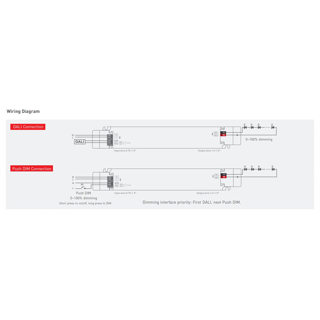 Dimming interface: DALI-2, Push DIMDimming range: 0-100%, LED Startup Current<0.1%Input Voltage: 220-240VacOutput voltage: 24VdcOutput current: 3.125ALoad power range: 0~75W Working temperature: ta: -20°C ~ 50°C tc: 80°C