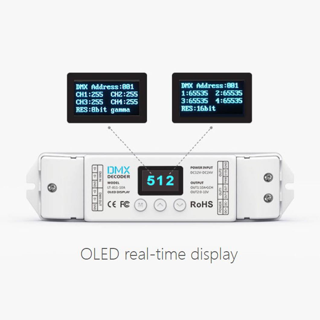 High end DMX decoder with real time OLED display. Capable of 8bit/16bit input and frame rate as high as 850FPS.
