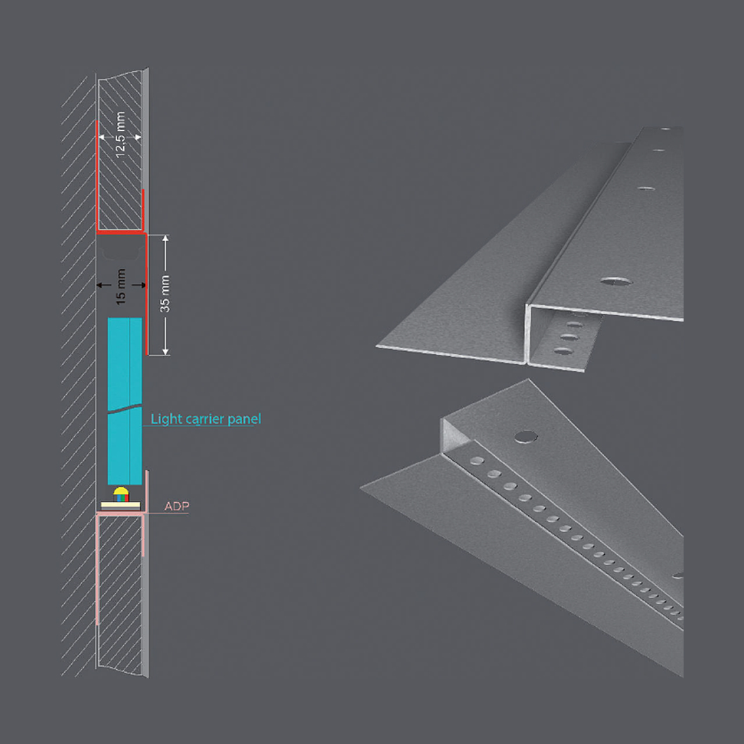 LED Profilelement ADP 35 drywall profile integrates invisibly with the surrounding architecture, and is the perfect choice for creating a dramatic indirect lighting effect for backlit signage, logos, advertising or artwork. Suitable for use with LED tape up to 15mm in width. 35mm visible wing for holding artwork in place. Made of zinc, which acts as a heat sink for the LED strip, the ADP 35 profile is supplied with the primer already applied. Diffuser not suitable for this profile. Fire rated, see downloads tab for further info.