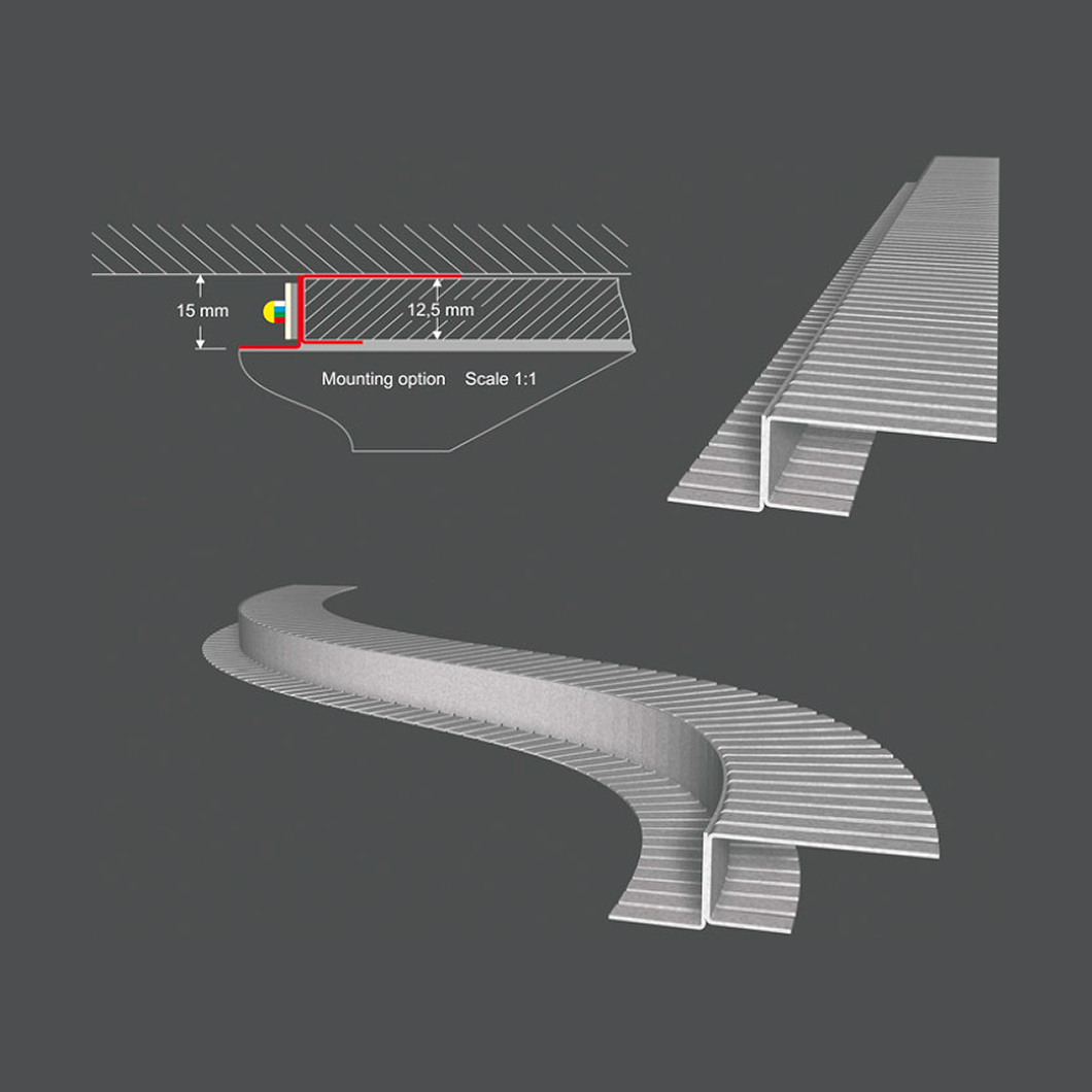 LED Profilelement ADP Flex drywall profile integrates invisibly with the surrounding architecture, and is the perfect choice for cove lighting and for creating dramatic curved indirect lighting effects either with or without a substructure. Suitable for use with LED tape up to 15mm in width. Shadow casting can be avoided by altering the plane that the LED strip is fixed to. Made of zinc, which acts as a heat sink for the LED strip, the APD profile is supplied with the primer already applied. Fire rated, see downloads tab for further info. No diffuser.
