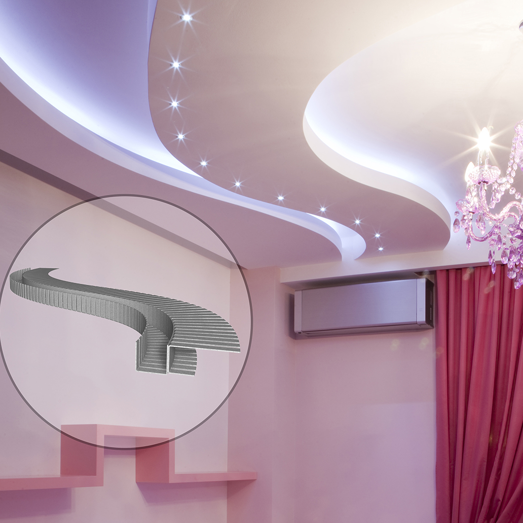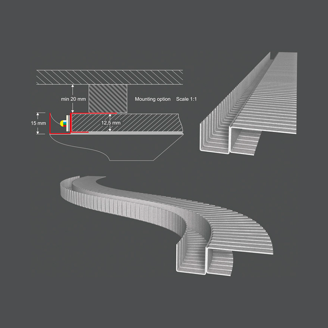 LED Profilelement DSL Flex drywall profile integrates invisibly with the surrounding architecture, and is the perfect choice for cove lighting and for creating dramatic indirect lighting effects behind 'floating' curved structures. Suitable for use with LED tape up to 15mm in width. Shadow casting can be avoided by altering the plane that the LED strip is fixed to. Made of zinc, which acts as a heat sink for the LED strip, the DSL profile is supplied with the primer already applied. Fire rated, see downloads tab for further info.