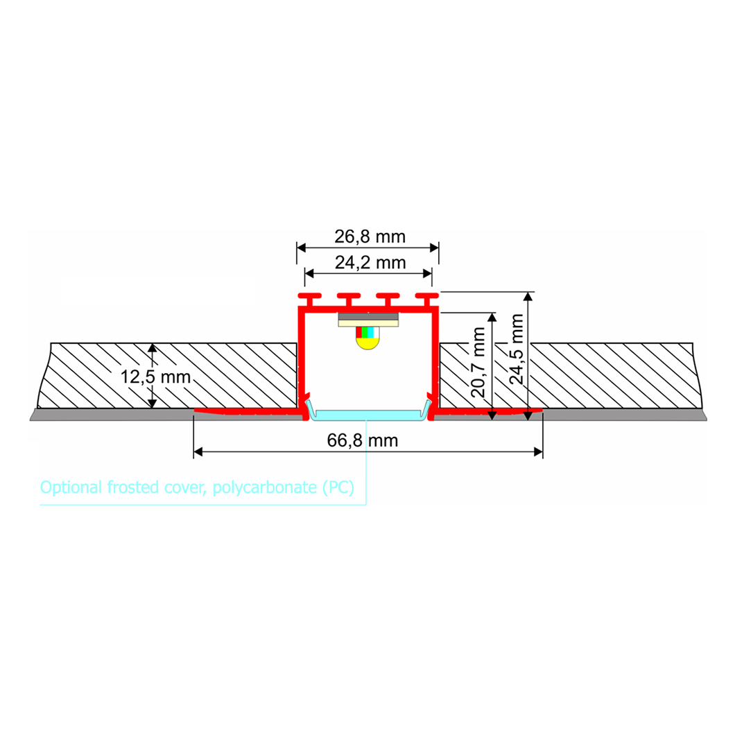 Length 2000mm Internal width 24.2mm Profile: aluminium Opal diffuser cover: polycarbonate (PC) included Optional end cap (PE85.0005): polypropylene (PP)