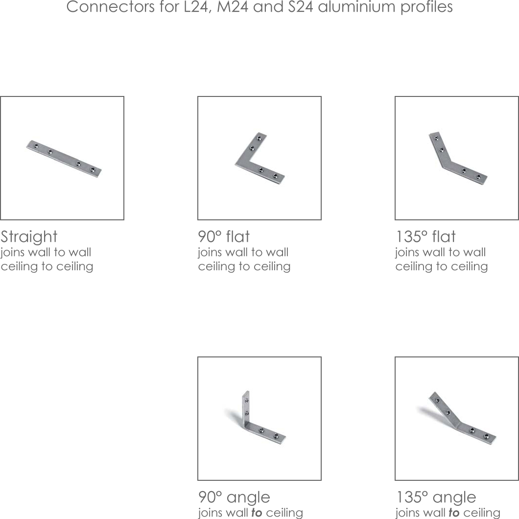 Supplied in 2m lengths. Various connectors are available to join on the same plane (flat) and wall-to-ceiling (angle), scroll through the images above for further details.