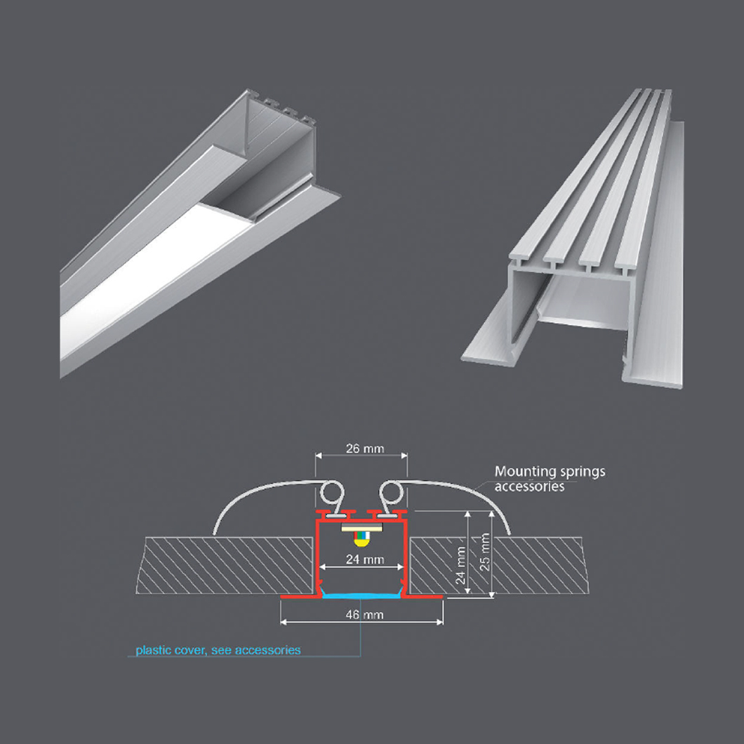 LED Profilelement S24 linear profile for concealed and integrated installation in walls and ceilings. The S24 LED recessed profile is made from high-grade aluminium, in which a maximum of 2 LED strips with 10mm width can be installed.