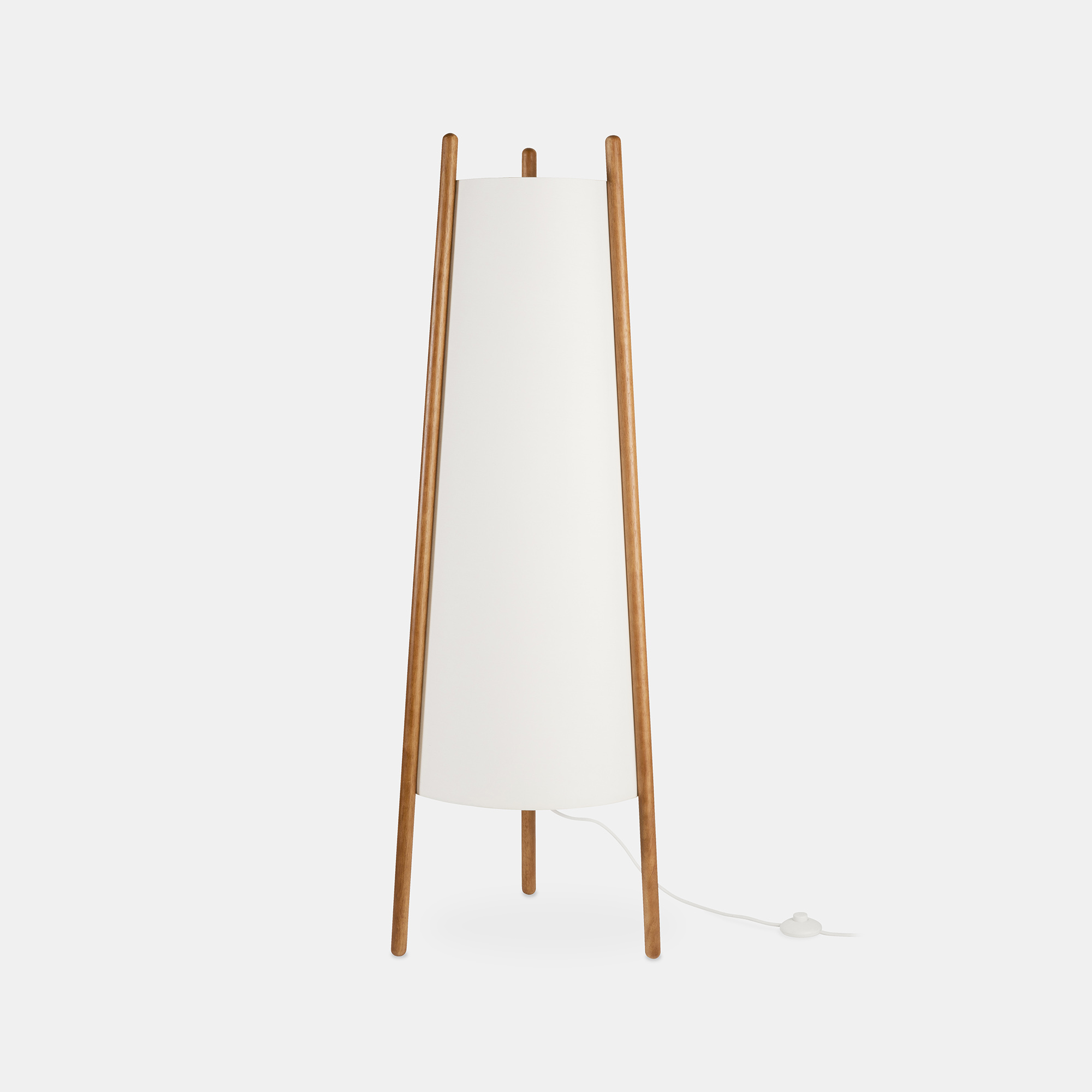 Woody elegantly showcases the classic tripod design. This is a decorative contemporary structure defined by three wooden legs which surround a tall cone-shaped textile diffuser. A minimalist, chic aesthetic makes this product perfect for use in modern interior spaces.