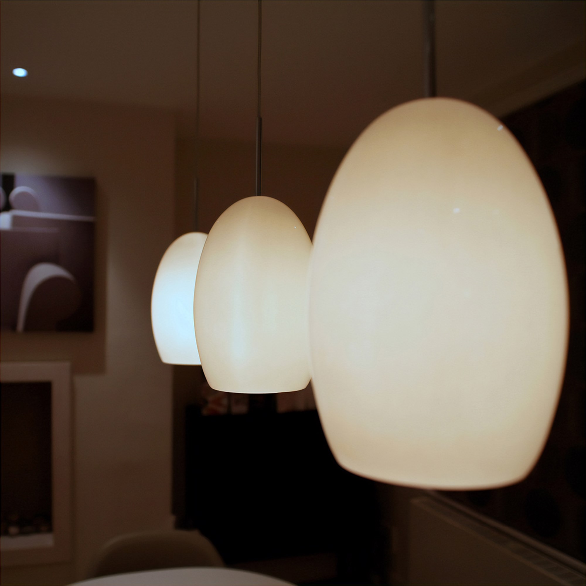 In the kitchen we wanted to create a feature over the dining table without imposing itself too much in the room. We achieved this by using the Morosini Egg Pendant made from bone china, this emits a beautiful soft light into the dining room. Downstairs in the stunning glazed basement room, we have used the Storm wall up and down light on the exposed brick work which looks visually stunning from the garden view. This combined with the Silenia Low Level Light at the botton of the stairs and stunning floor and table lamps by designer Jasper Morrison Glo - Ball from flos really give this area style and character.