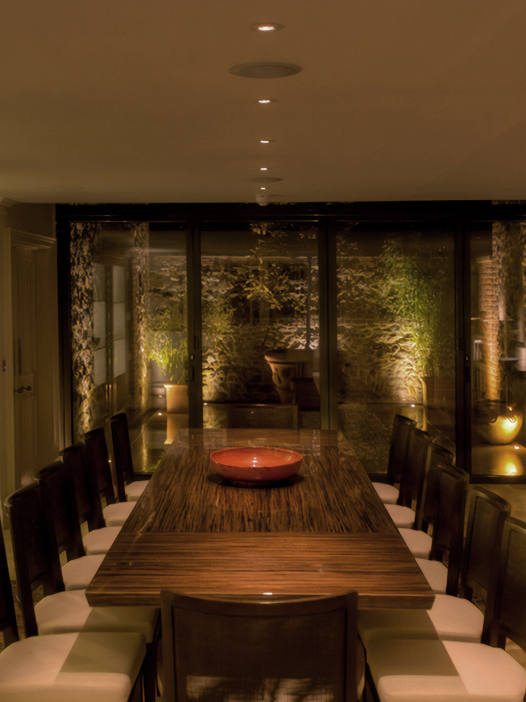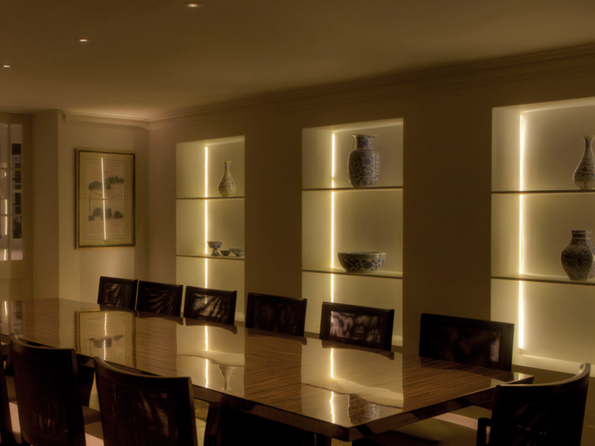 The client wanted a good overall light level but with the flexibility to change the mood if required. Darklight achieved this by using a range of different lighting circuits, with light coming from several different levels, down-lights from the ceiling for wall washing, wall lamps in various areas and floor up-lighting in several rooms including the entrance archways. We also have used linear hidden LED in dining room niches, kitchen and bathrooms.