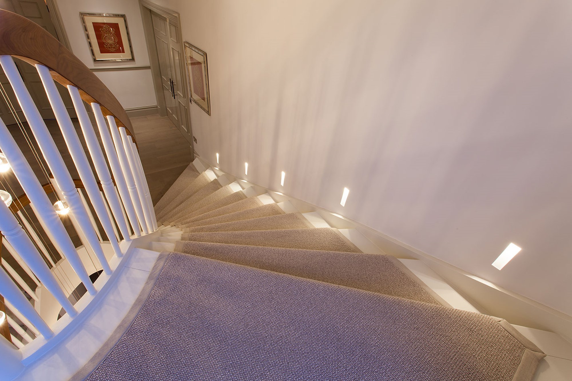 The main focus of the house is the stunning stairwell which runs centrally from the third floor to the basement. The equally stunning Bocci chandelier has been utilized to instil a strong visual link - positioning orbs of light at varying heights creates a central feature that is visable from all floors of the house. The simple but very effective Darklight Design Juno and Vesta recessed downlights were specified for the majority of the rooms, strategically positioned to highlight wall art and architectural features. Low level floor lighting and recessed uplighting was achieved with the Atelier Sedap Slot and Flexalighting Tera 6.