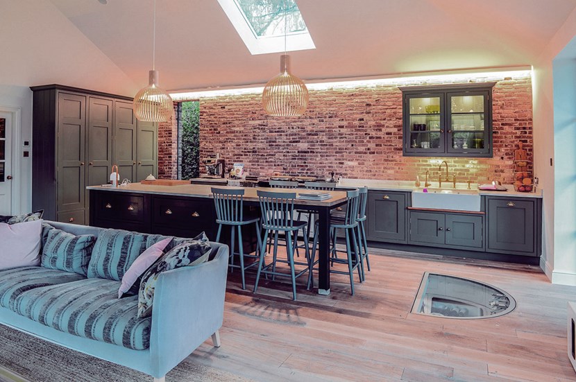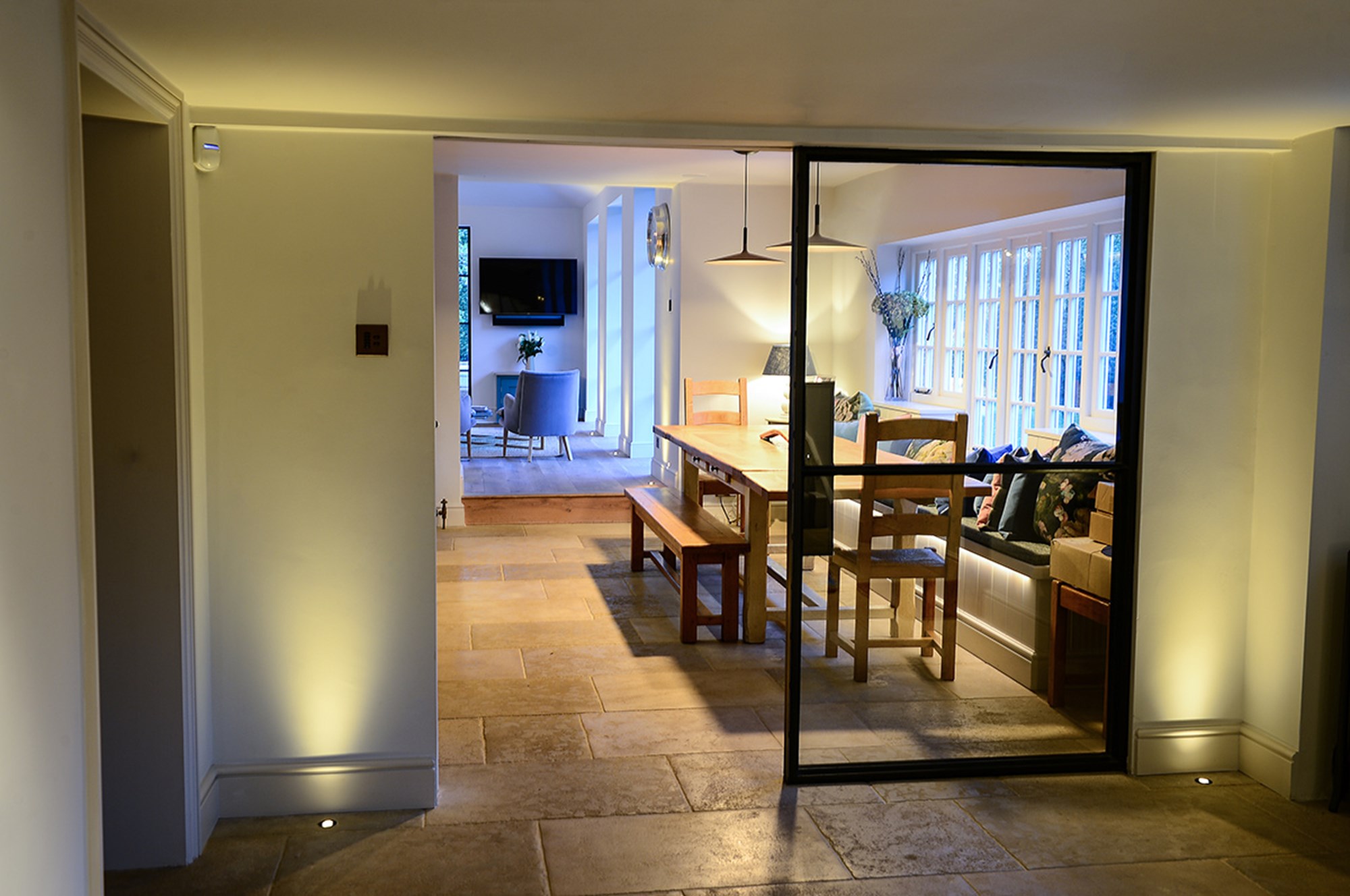 Downlights are kept to a minimum in the new, modern rustic-style kitchen slash family room because illuminating sloping ceilings and feature walls without downlights maximises interest. Instead we colour matched the majestic kitchen pendants and elegant up-and-down wall light with a discreet wall mounted linear profile on the stunning brick feature wall. Subtle Flexalighting Tera 6 IP67 recessed floor uplights highlight the unusual angles of the roof while a select few Eiger 1R LED recessed adjustable plaster in downlights provide task lighting when needed. Outside, Flexalighting Aloha 6 IP65 exterior spotlights and Flexalighting Tera 7 IP67 recessed floor uplights pick out shrubs in the garden, while portable rechargeable lamps - Tetatet by Davide Groppi and FollowMe by Marset – give the patio dining table an atmospheric glow.