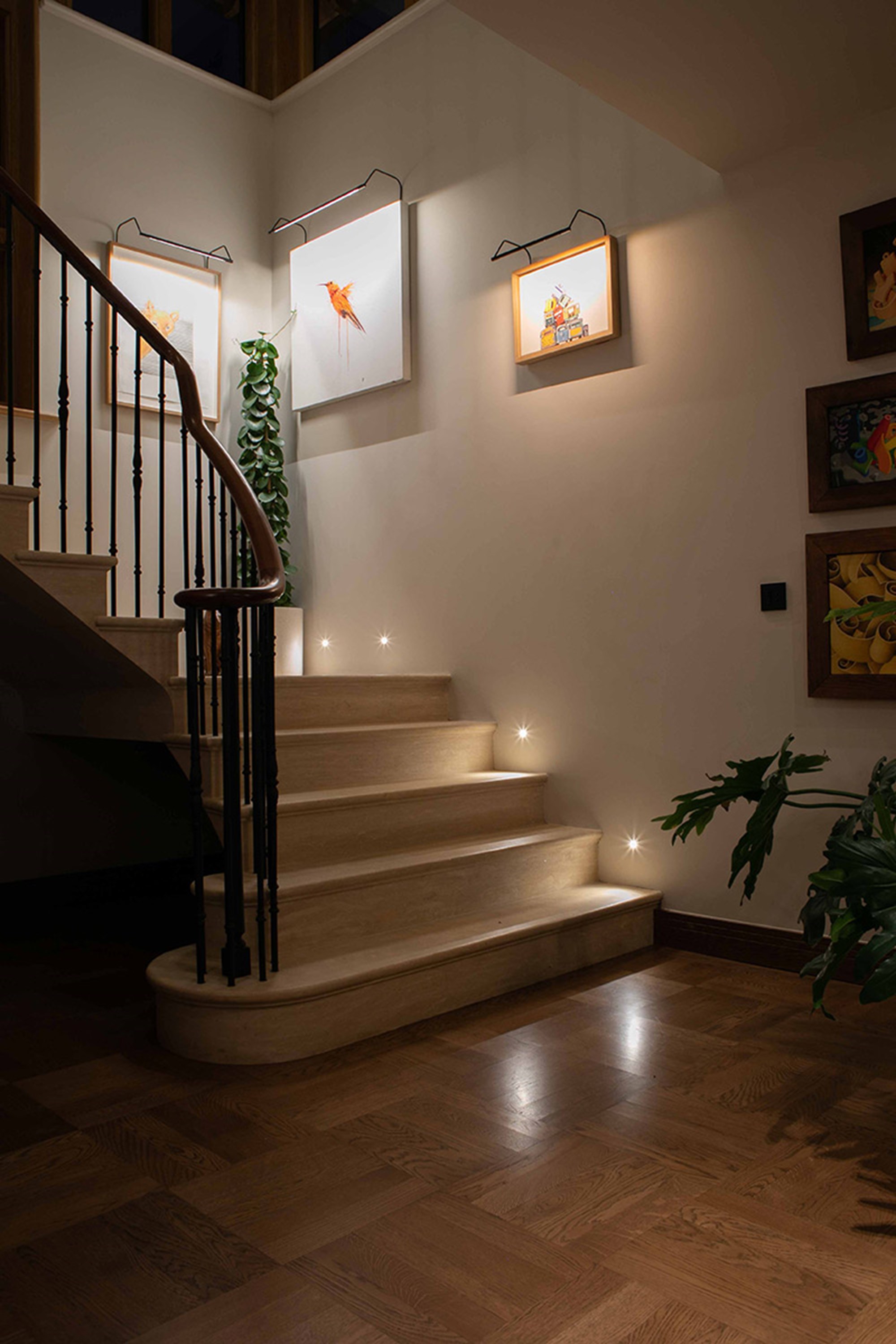 The client has an eclectic style that we love - the mid-century influences make you want to relax after a hard day with an Old Fashioned à la Don Draper. The key for the balance of the lighting design was to complement the incredible individualism of the artwork and furniture. We used plaster-in Eiger single adjustable downlights and twin adjustable downlights to provide general lighting that recedes into the architecture. In keeping with this theme, Passi plaster-in step lights were installed to provide subtle floor washing on the staircase and hallways. Altea round uplights are recessed into the floor and pick out the architectural details of the fireplaces.