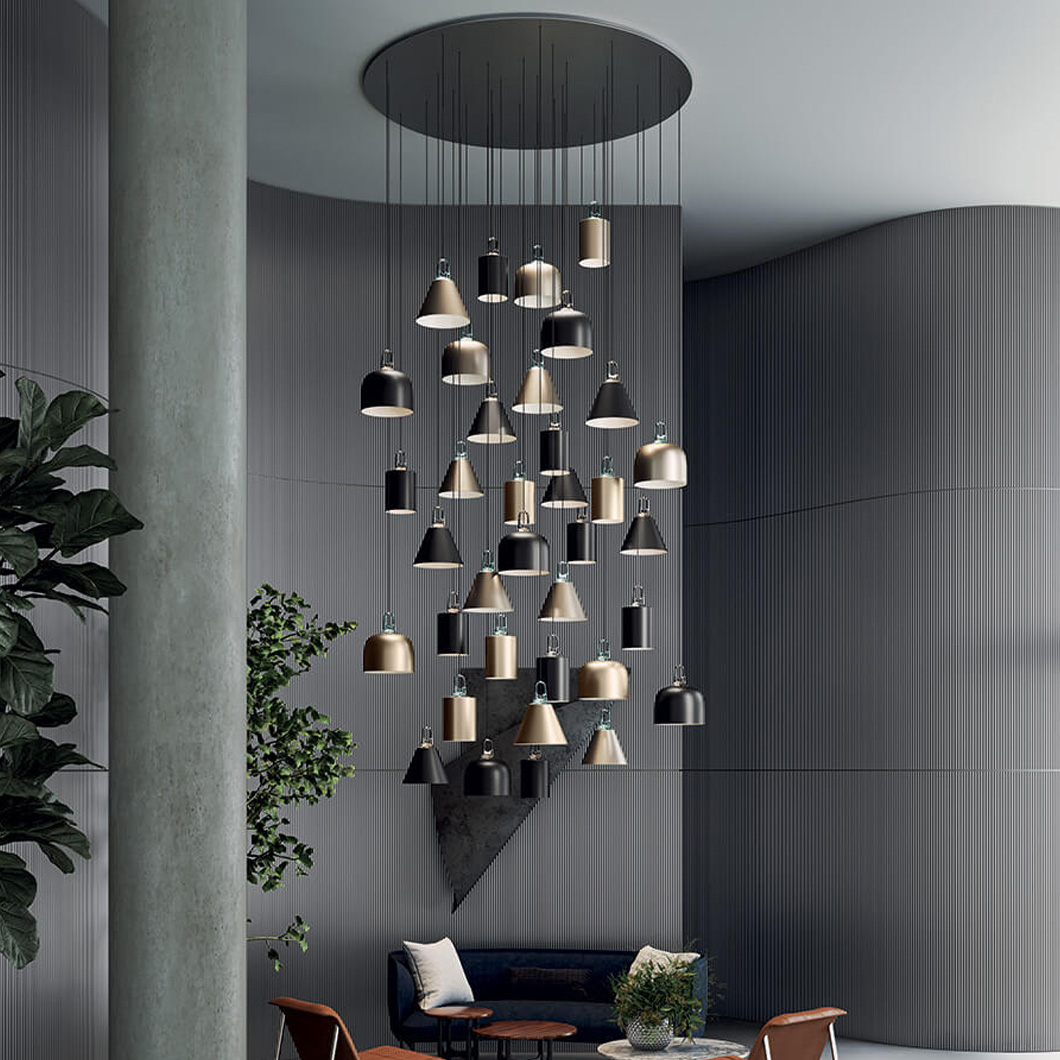 Create your own striking cluster composition of Lodes pendants using these versatile cluster canopies. Choose whether to mix-and-match different pendants to form intriguing architecture, or instead create a powerful configuration using several of the same suspension light. These ceiling rose vary from a eye-catching 14 drop to a monumental 36 drop canopy, which will be the elegant focal point in any open space.