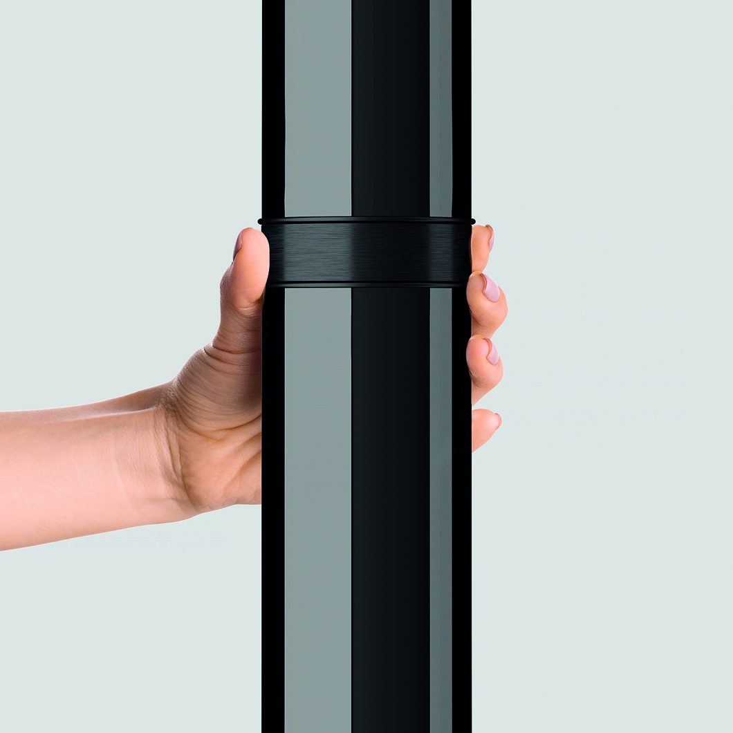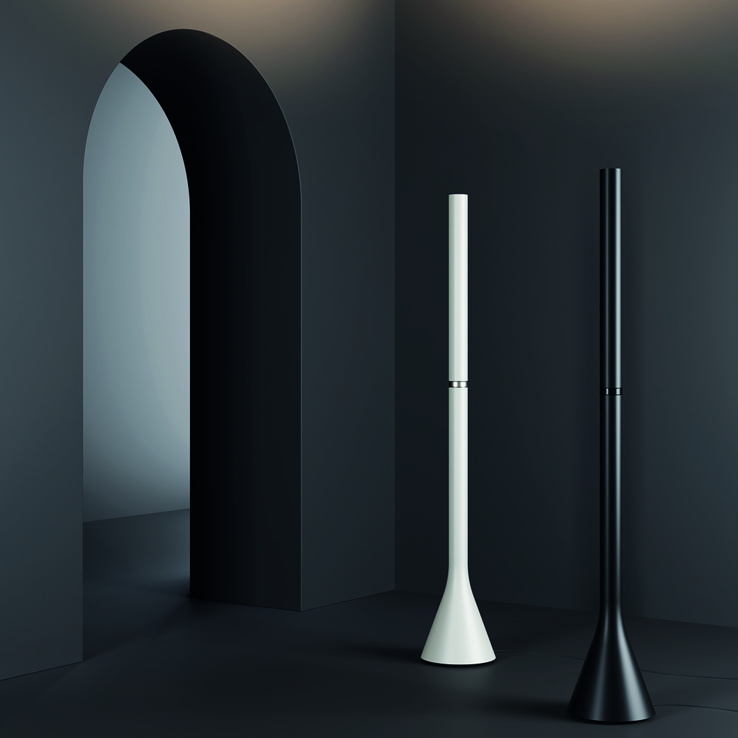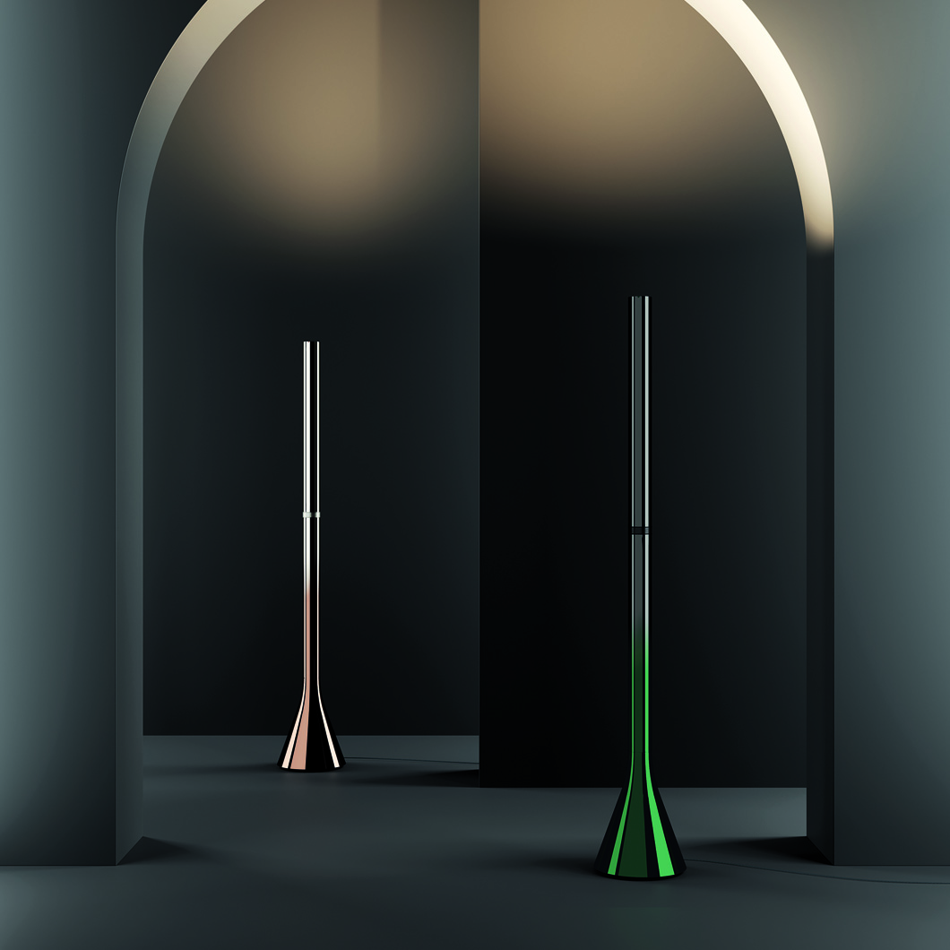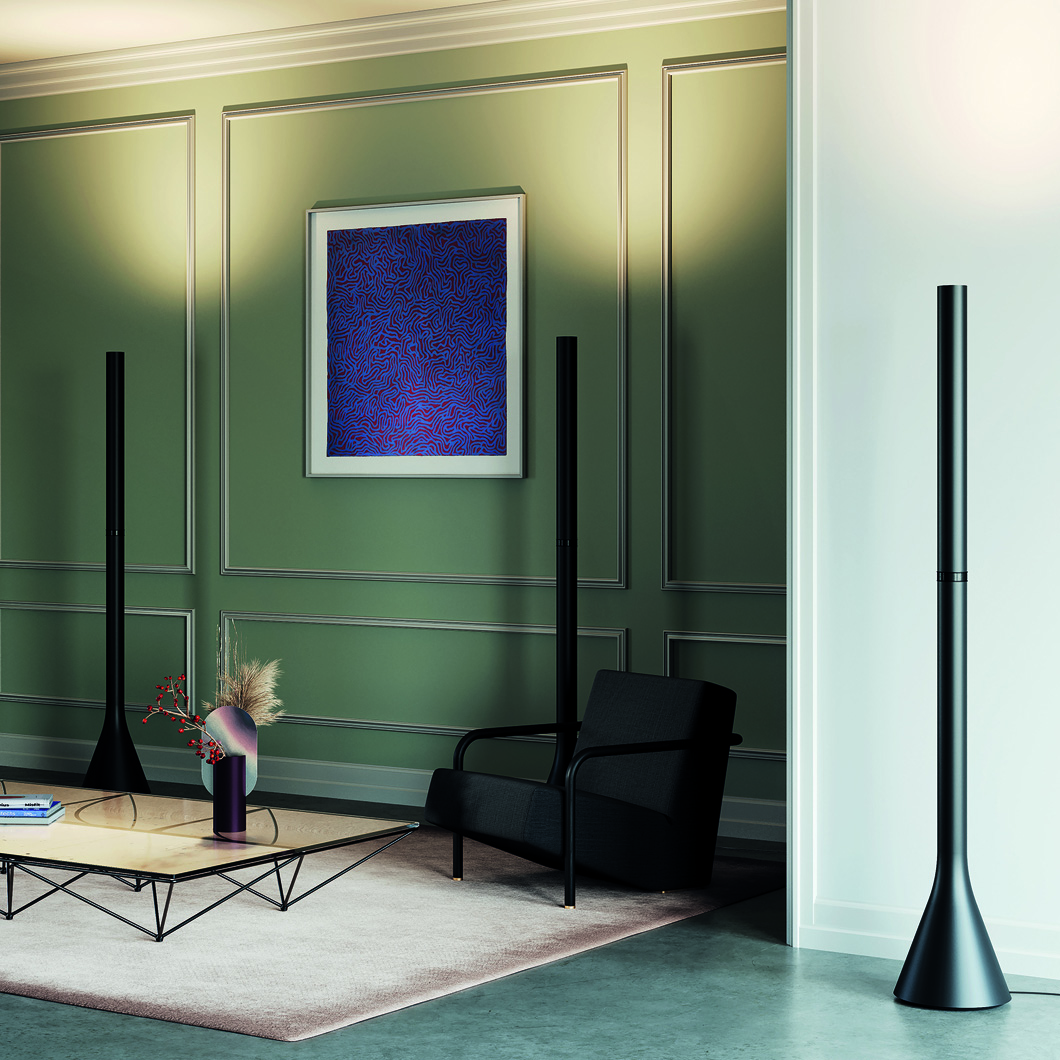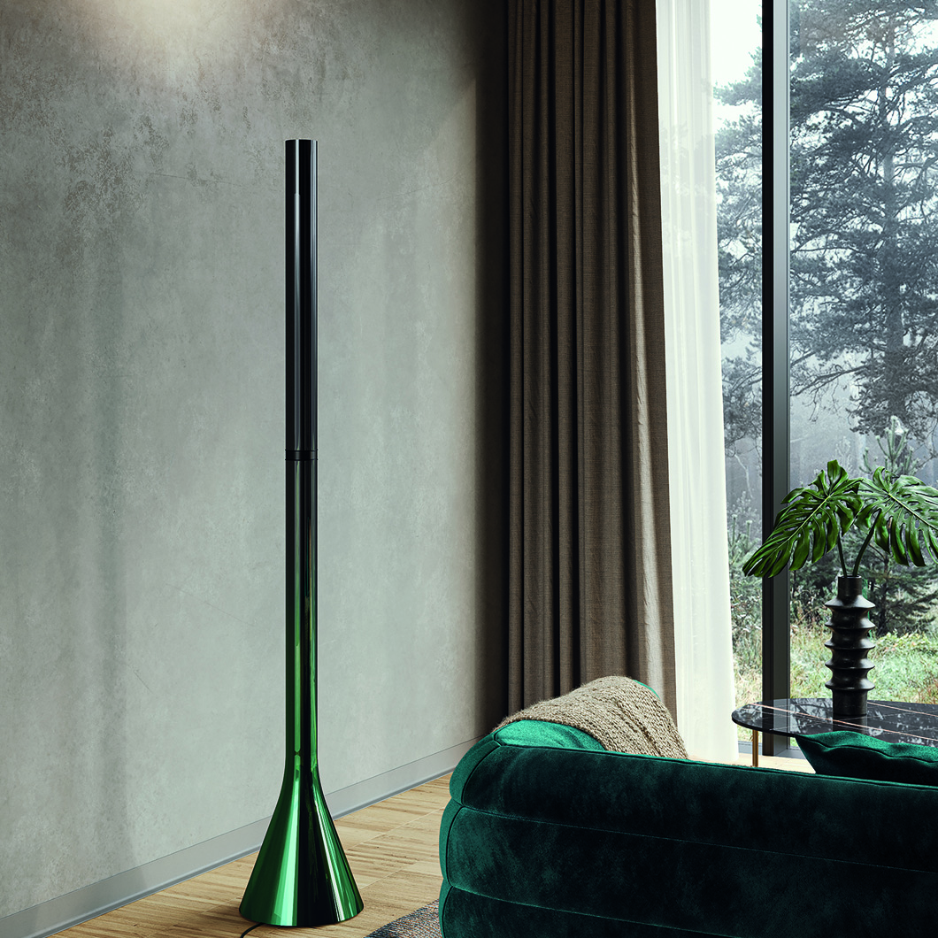 Bold and revolutionary, the Lodes Croma is an eye-catching floor lamp at 186cm tall, stealing the attention of everyone in the room. Translating to ‘Quaver’ (the eight note in music), the influence is clear in the design from the slender vertical structure which is available in 4 finishes: green, bronze, matt white and matt black. The light source is located at the top end of fitting, producing an upwards wash of light on the surrounding walls and ceiling. At the halfway point of the elegant stem, you can find a disk for access to its flashy dim-to-warm LED technology, alternating between 2200K-3200K at a powerful output. Croma’s green and bronze finishes are metallic chrome effects which fade towards the top half (green to black and bronze to nickel) whereas the matt finishes are uniform but texturised, offering another dimension in effect.