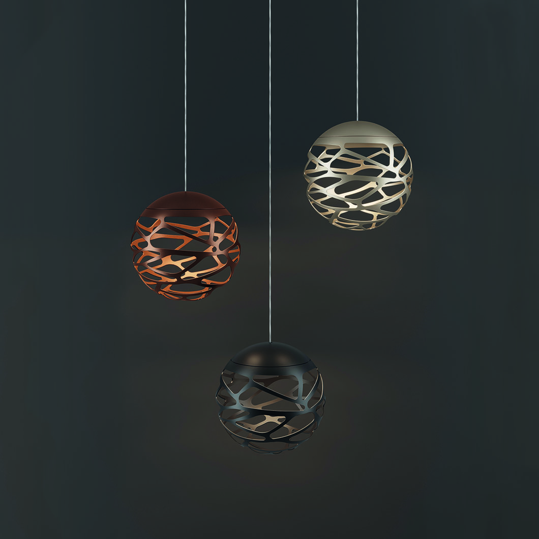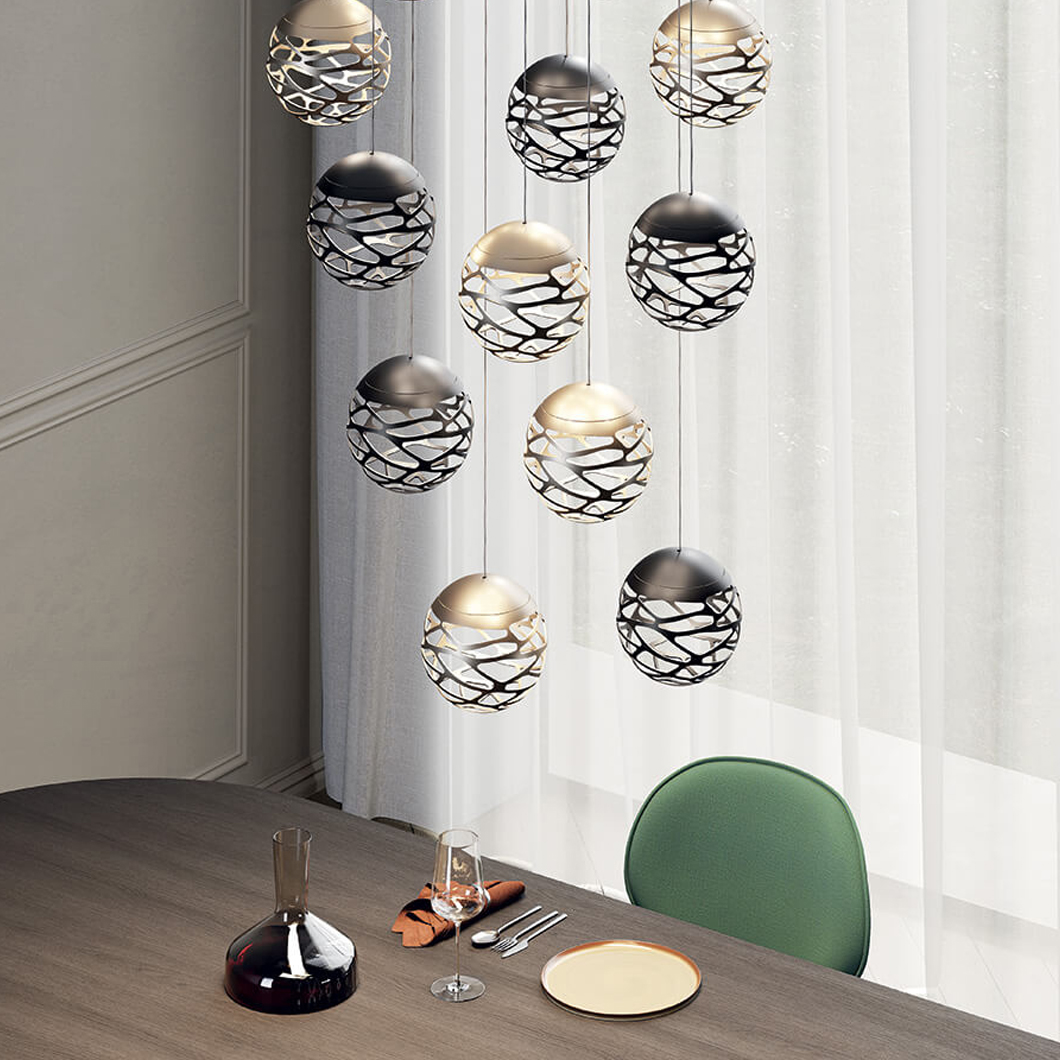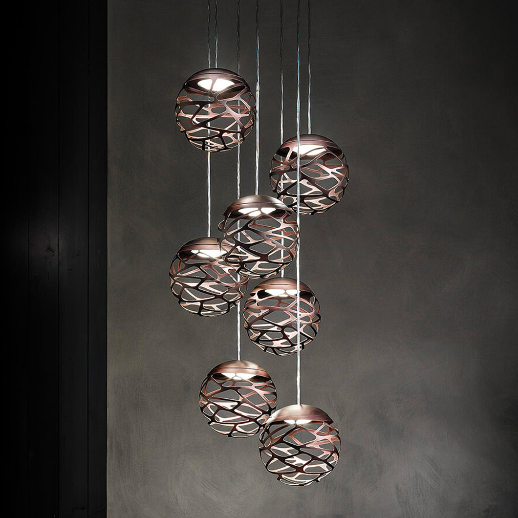 Distinguished by its intricate patterns on the precisely laser cut metal shade, this pendant a perfect representation of the decorative theme behind the Kelly family. The Kelly Cluster Sphere is a charming and eye-catching compact suspension light which can be found elegantly hanging from the top of a spiralling staircase or in the centre of a living room.