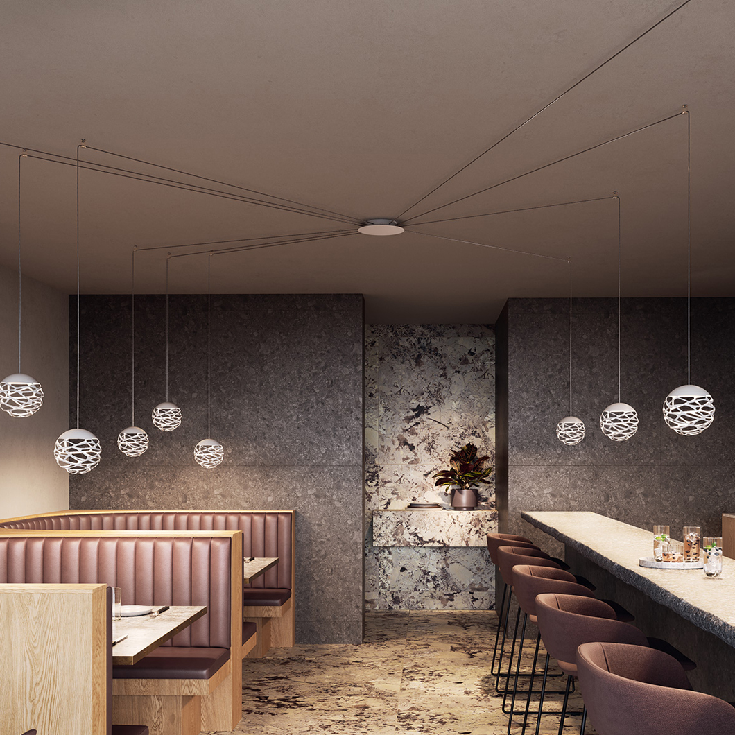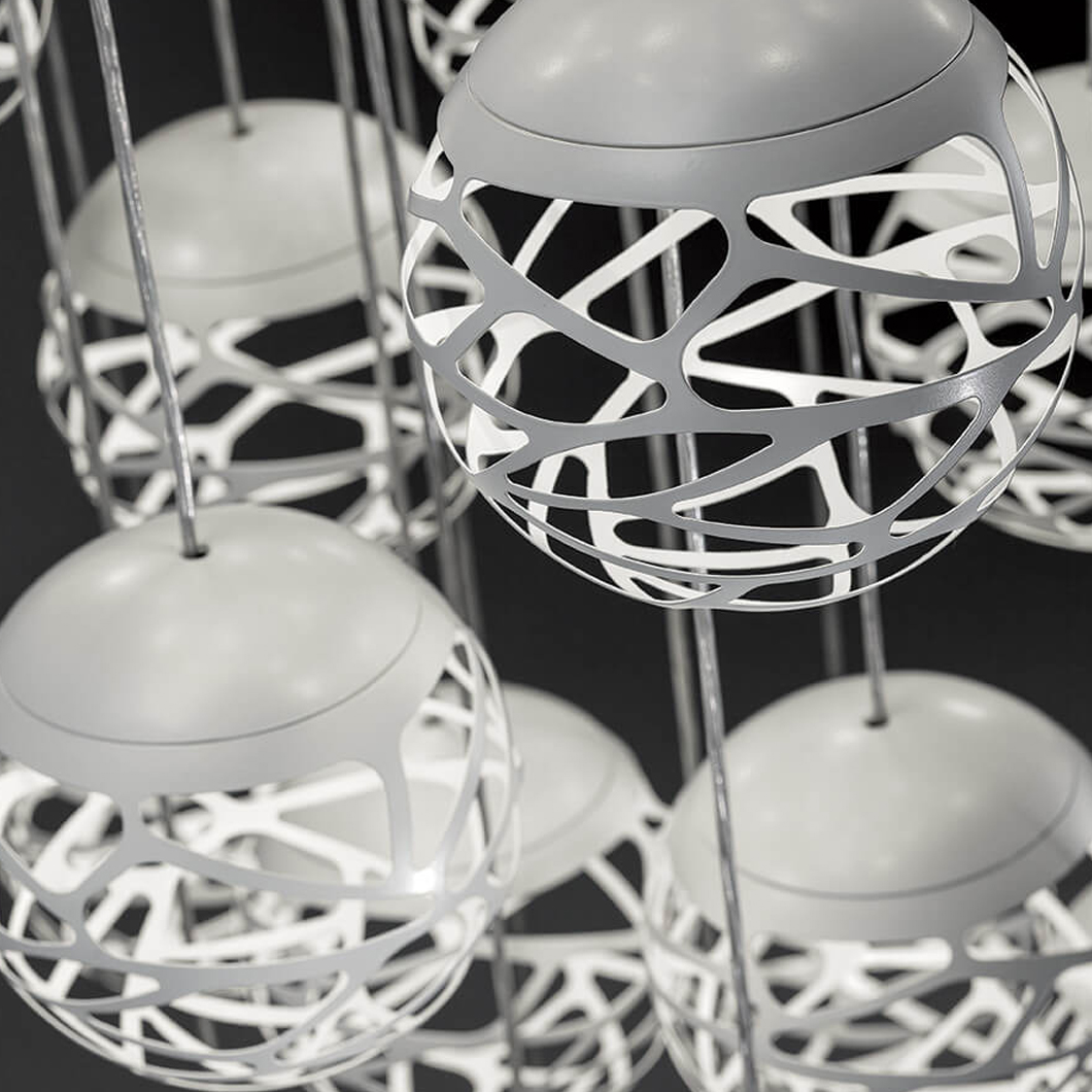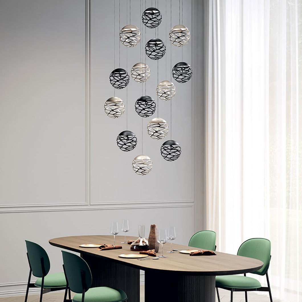 Distinguished by its intricate patterns on the precisely laser cut metal shade, this pendant a perfect representation of the decorative theme behind the Kelly family. The Kelly Cluster Sphere is a charming and eye-catching compact suspension light which can be found elegantly hanging from the top of a spiralling staircase or in the centre of a living room.