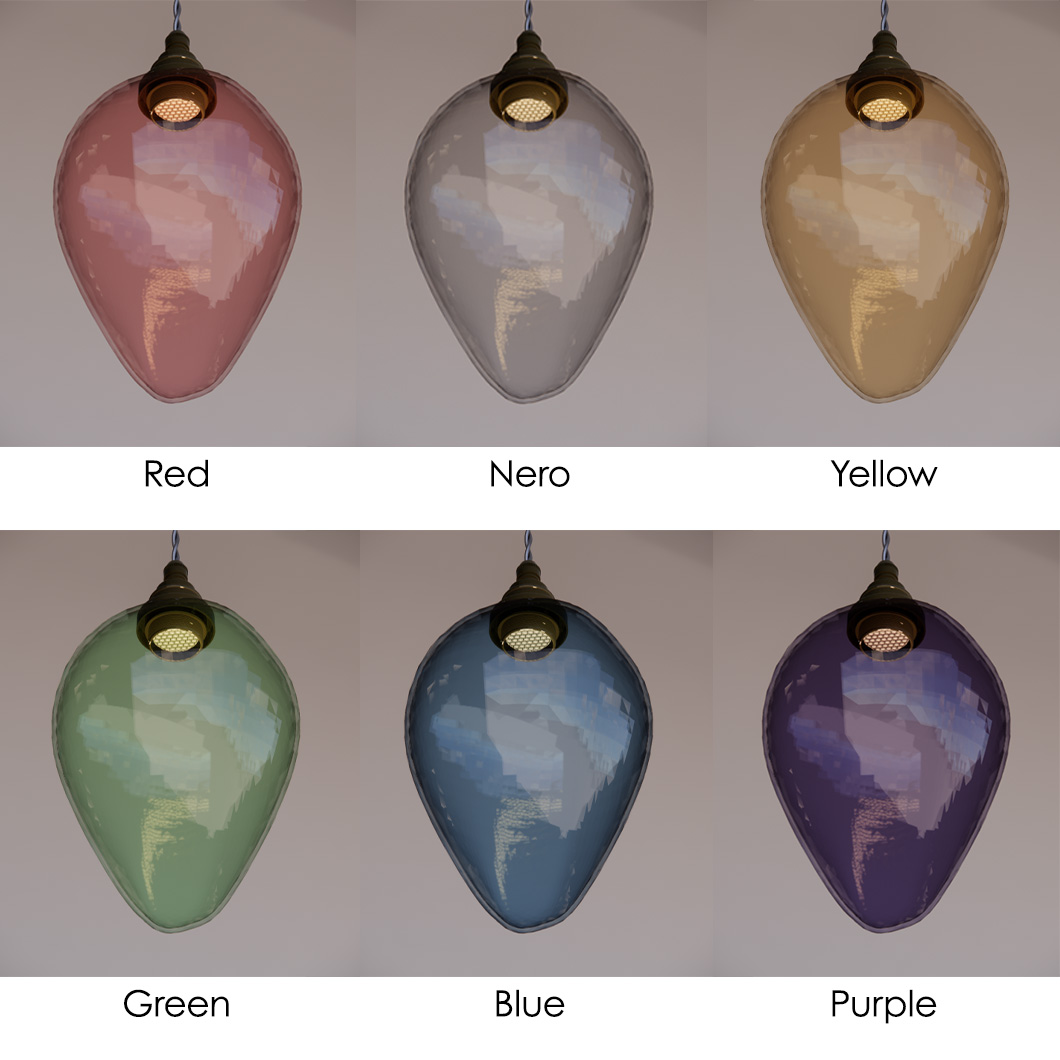 Charlice has a 155mm diameter and a 210mm height, and is connected to a dark bronze metal base. The elongated glass diffuser is available in 6 colours, ranging from neutral and minimalist to bold and bright. Choose from nero, red, yellow, blue, green, or purple. Equipped with a 2700K LED, Charlice emits a warm-white glow that enhances the ambience of an interior. Driver not included.