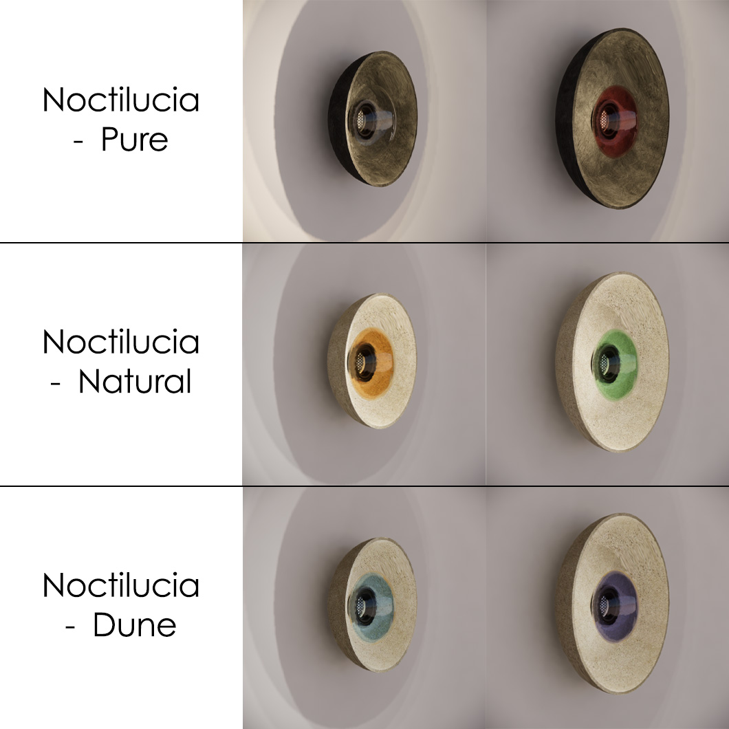 Noctilucia's ceramic base is available in three neutral colours: pure, natural, and dune. The core glass element comes in 6 diverse finishes: nero, red, yellow, green, blue, and purple. Equipped with a 5.6W LED, Noctilucia emits a warm-white 2700K glow that enhances the ambience of a cosy interior. Check the downloads tab below for installation instructions. Driver not included.