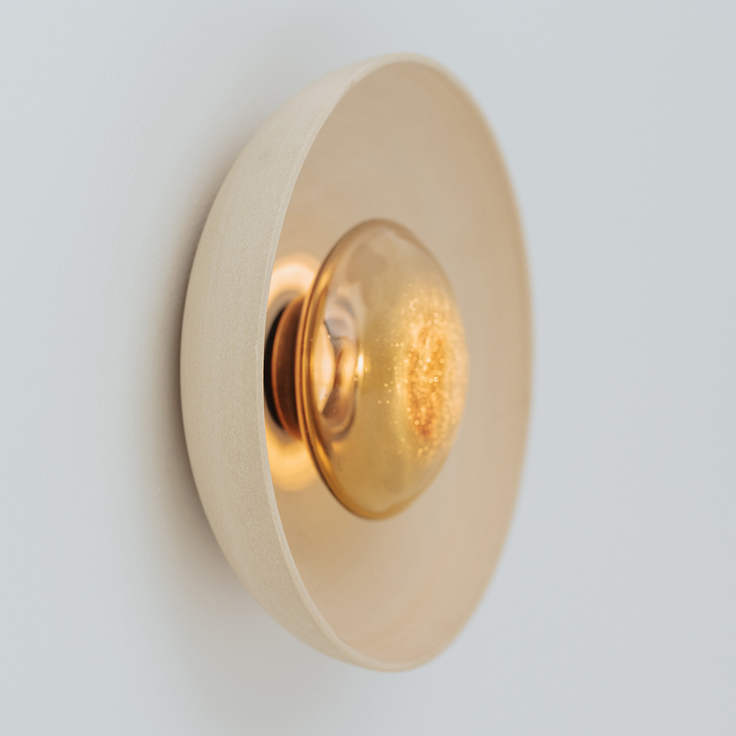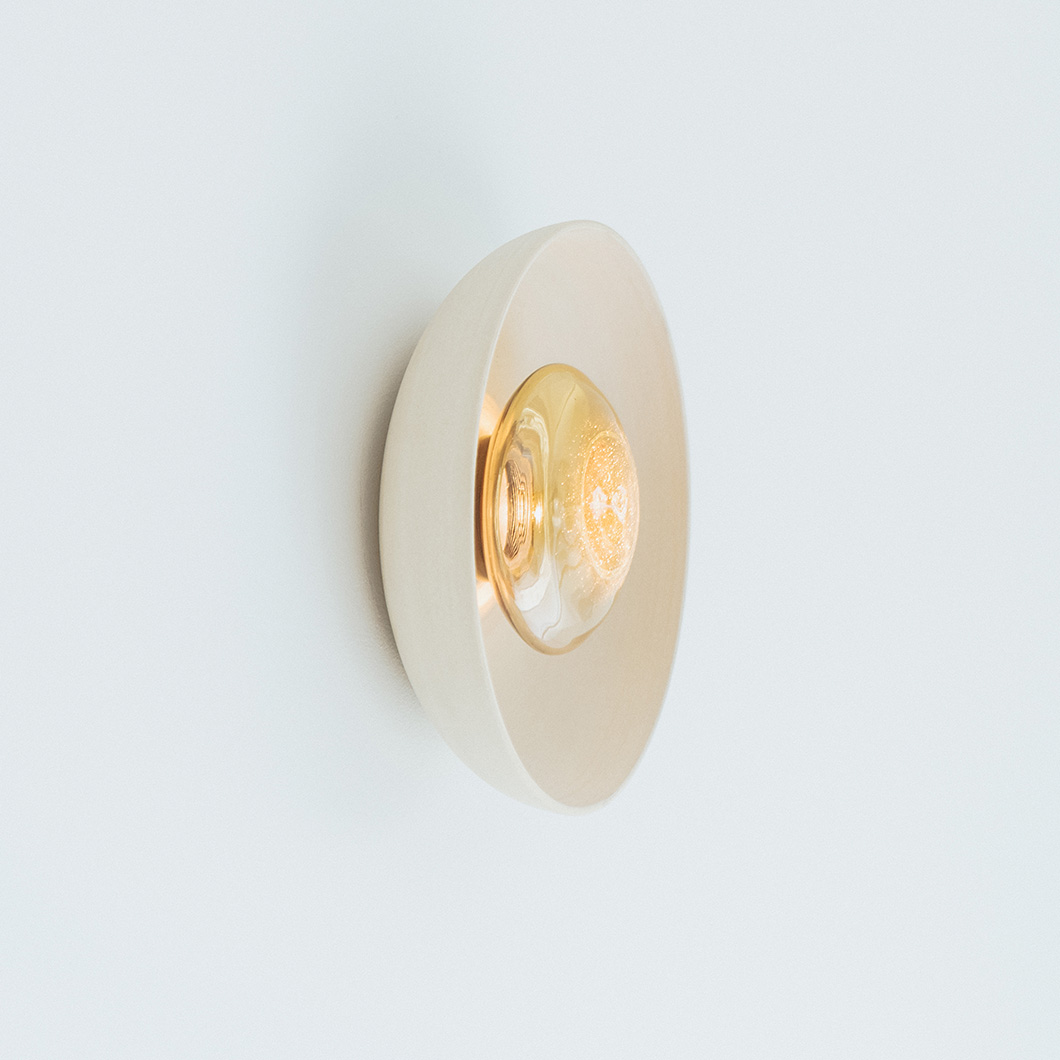 Combining pure craftsmanship with minimalist, modern design, Noctilucia by L'ombre is a decorative wall light to accentuate a contemporary interior. Crafted from mouth-blown glass and ceramic, the simple design features a curved ceramic plate with a central glass diffuser. Available in two sizes, Noctilucia M has a 175mm diameter, and Noctilucia L has a 215mm diameter. The elegant luminaire can be installed independently for a more minimalist aesthetic, or in a row of three for a bolder, decorative statement.